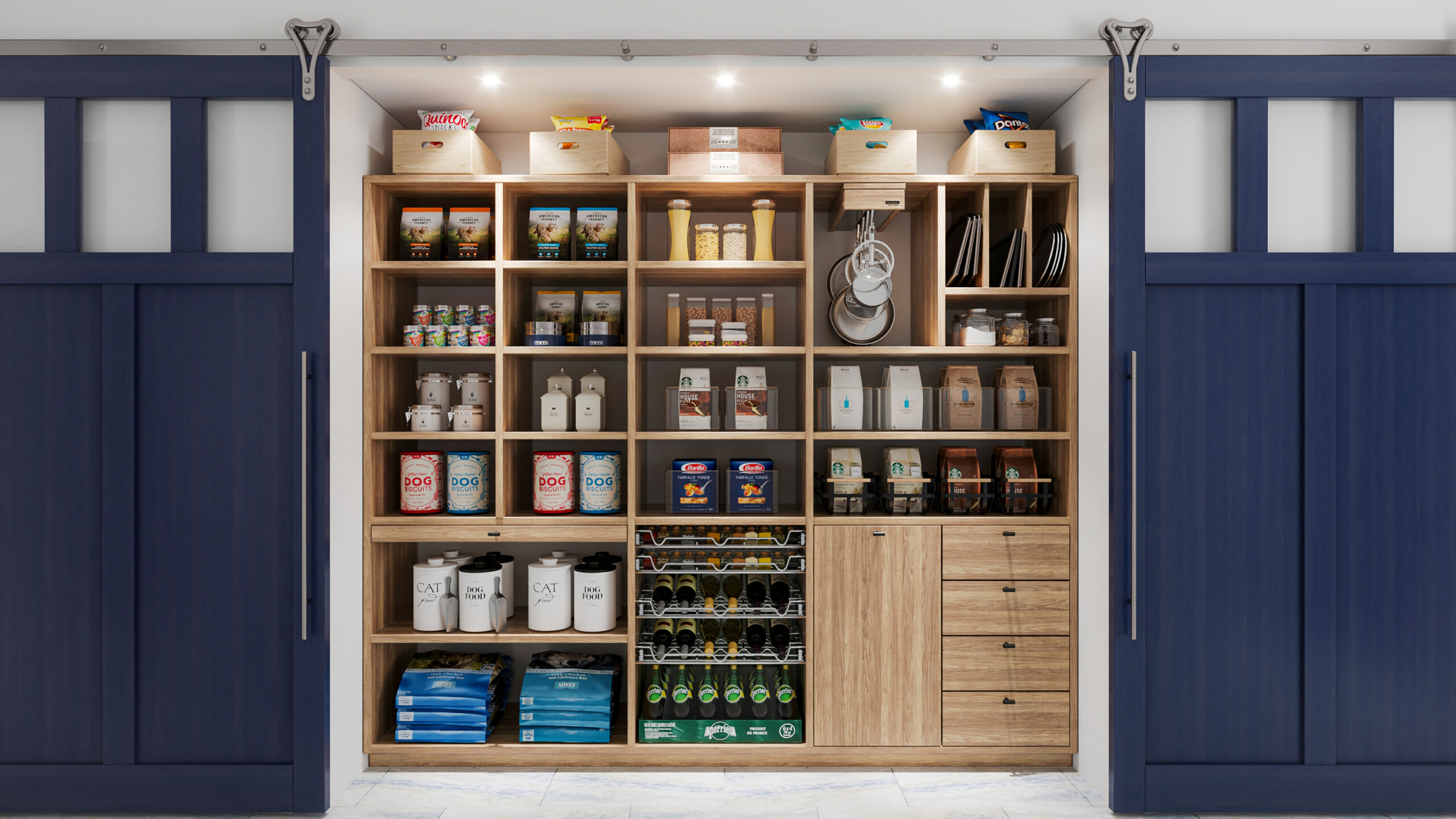 Bulky, heavy items, such as supersized options bought at warehouse stores, belong on the bottom shelf of your pantry. Not only will you save yourself muscle strain or accidental drops, you’ll extend the overall life of your pantry.