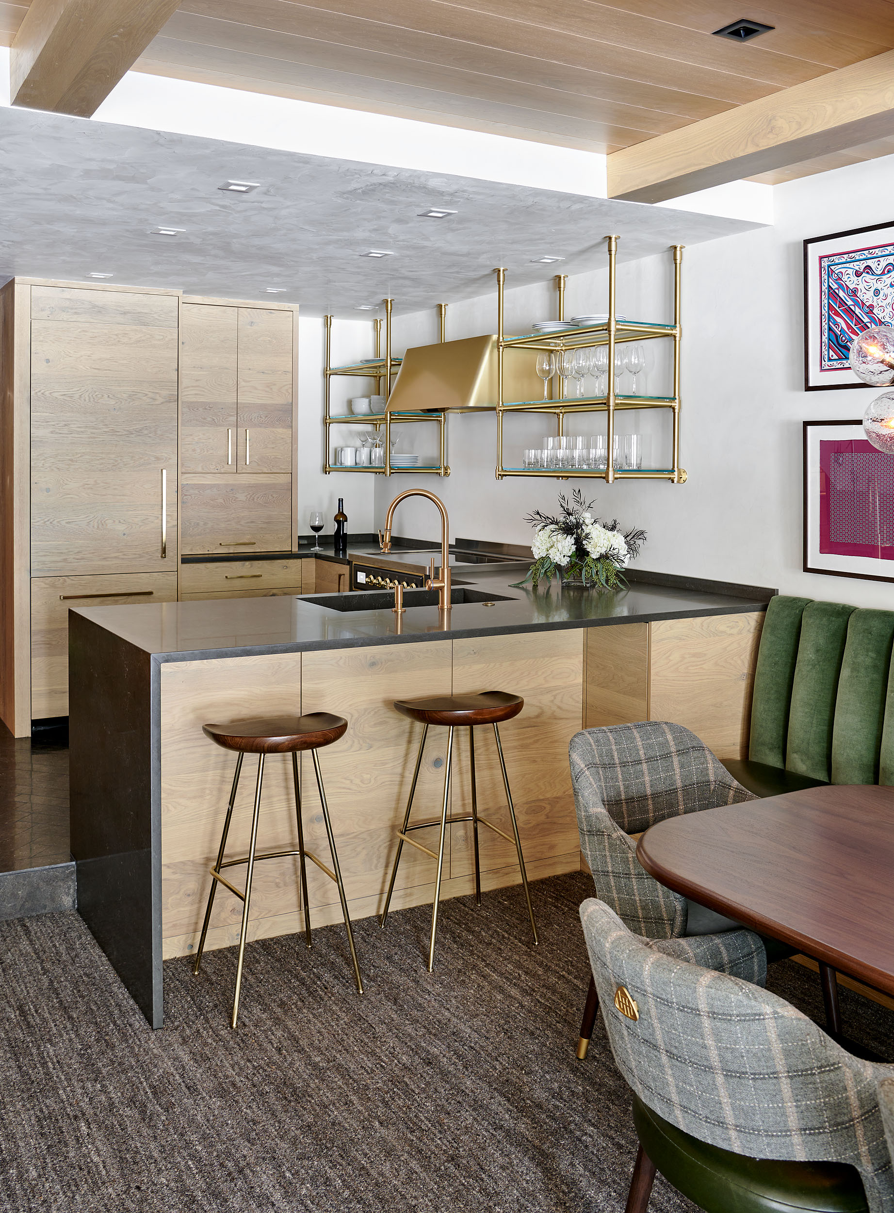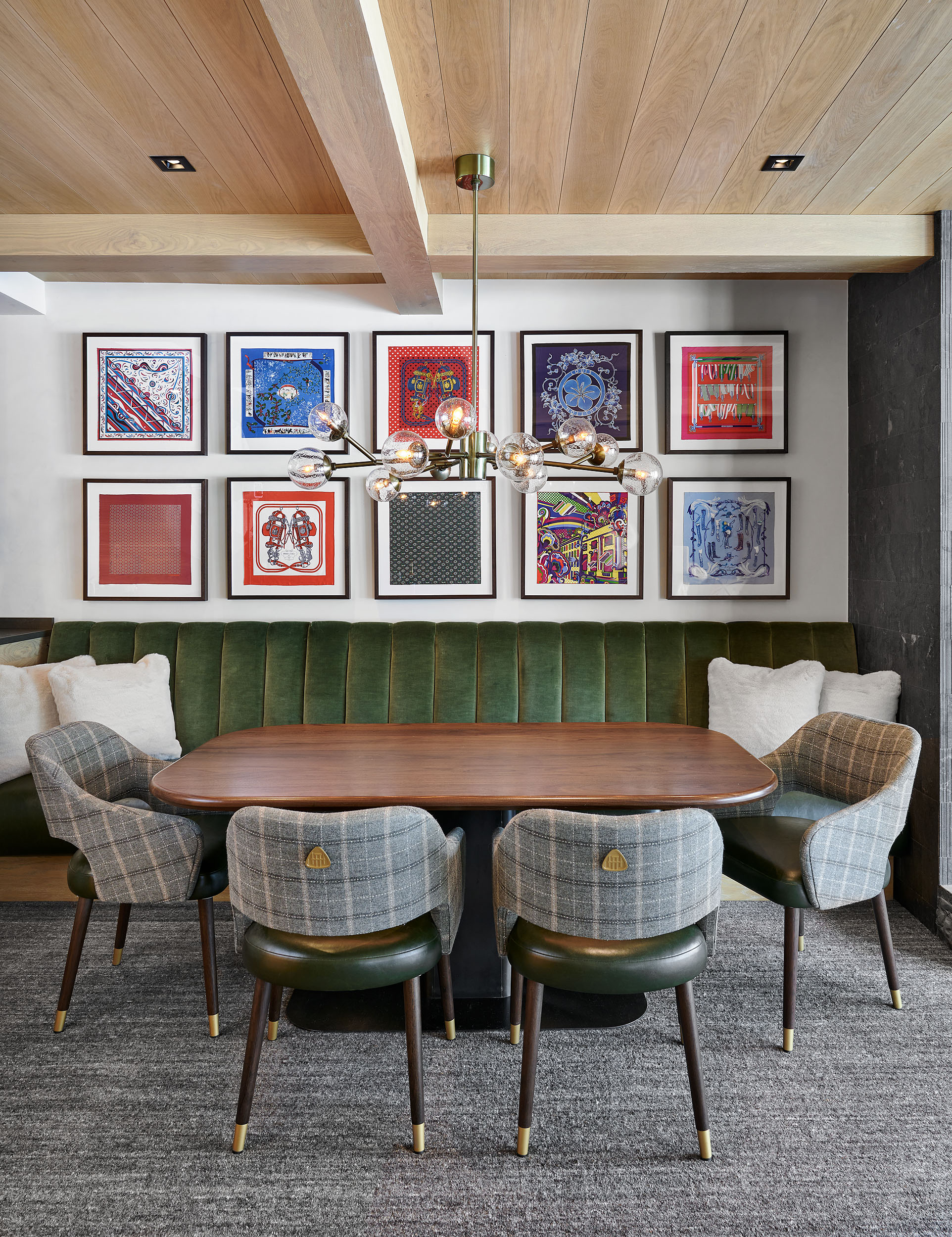 Speaking of boxes, Grice refers to the condominium as a “jewel box,” and it won the ASID Crystal Award in Colorado and New Mexico for 2023 for the best remodel under 5,000 square feet. “Every surface was thought through and works together,” she says, noting they incorporated beautiful accents such as the collection of framed Hermes silk scarves in the dining room, the Franz Viegener gold plumbing fixtures and such custom furniture pieces as a green velvet banquette. “Each piece can stand on its own but together makes up a jewel box.”