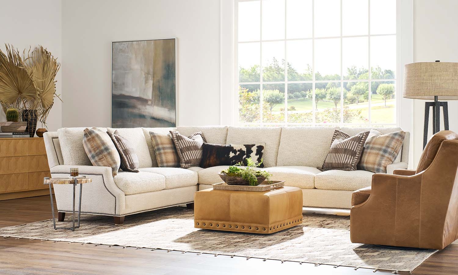 Sectionals can be adapted for larger gatherings, providing a comfortable space for lots of folks to settle in. And swivel chairs are particularly versatile because they allow guests to pivot between the main conversation area and other parts of the room. Be sure to add in strategically-placed tables to accommodate snacks and beverages and consider bringing in a few colorful poufs for extra seating.