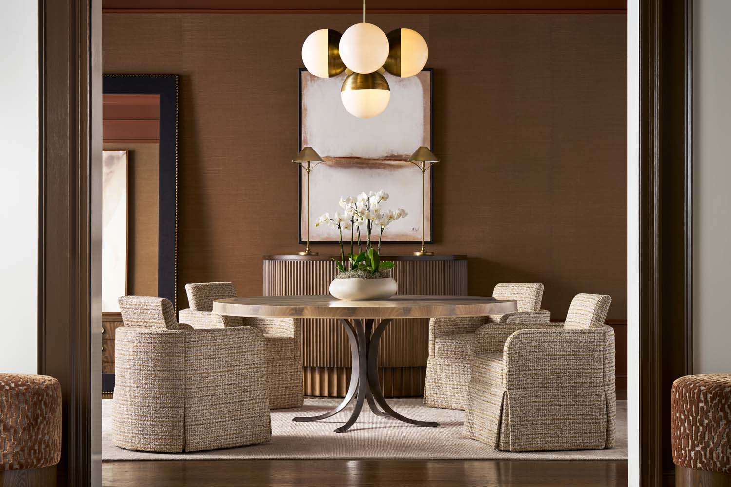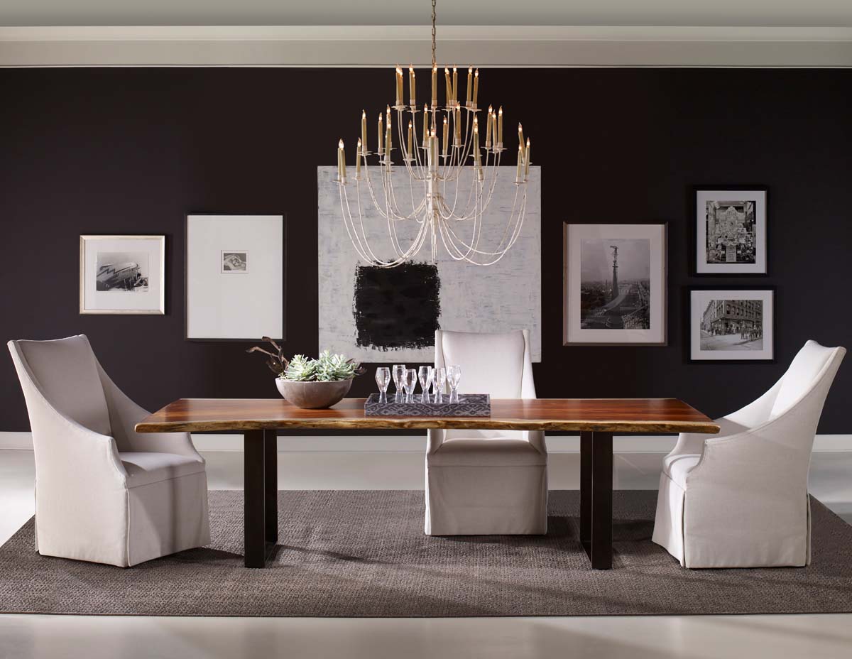The dining room should be as inviting as the living room, with an atmosphere for both feasting and lingering afterward. Choose the right table for your space, one that is versatile enough to accommodate intimate family dinners as well as larger gatherings and reflects your home’s style and personality. Add chairs that are both comfortable and properly proportioned for your table.