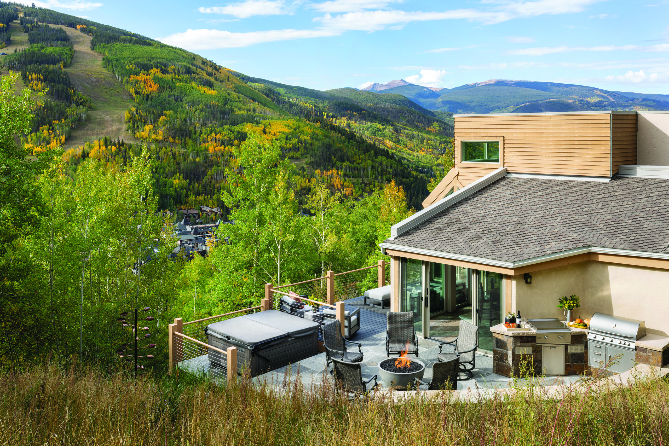 Sean Raftery still recalls the day in 2020 when his father-in-law called to tell him an end-unit townhome in Vail’s coveted Potato Patch neighborhood was on the market and that he and his wife, Karen, should buy it. “I immediately called the realtor, and we bought it sight unseen,” he says, noting the decision wasn’t as rash as it might seem. “Karen’s family owns a townhouse in the same area, and she was used to spending winter and summer vacations there when we met. And we knew the location was a good one.” “Good” might be an understatement about the easternmost unit that nestles into a stand of aspens, has a high degree of privacy, and enjoys heady views of Vail Mountain. Architect Beth Levine, who worked with Raftery’s father-in-law previously, appreciated the townhome’s prime location.