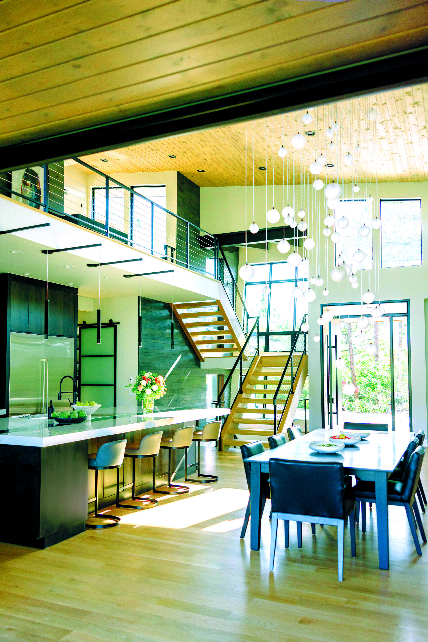 Great Room A custom-designed light fixture draws the eye upward. “The hand- blown glass reflects the unpredictability of the exterior landscaping in the home’s interior. The other goal was to see a beautiful fixture driving to the house at night when it was lit up,” says Eckelhoff. | Photo: Alison Vagnini