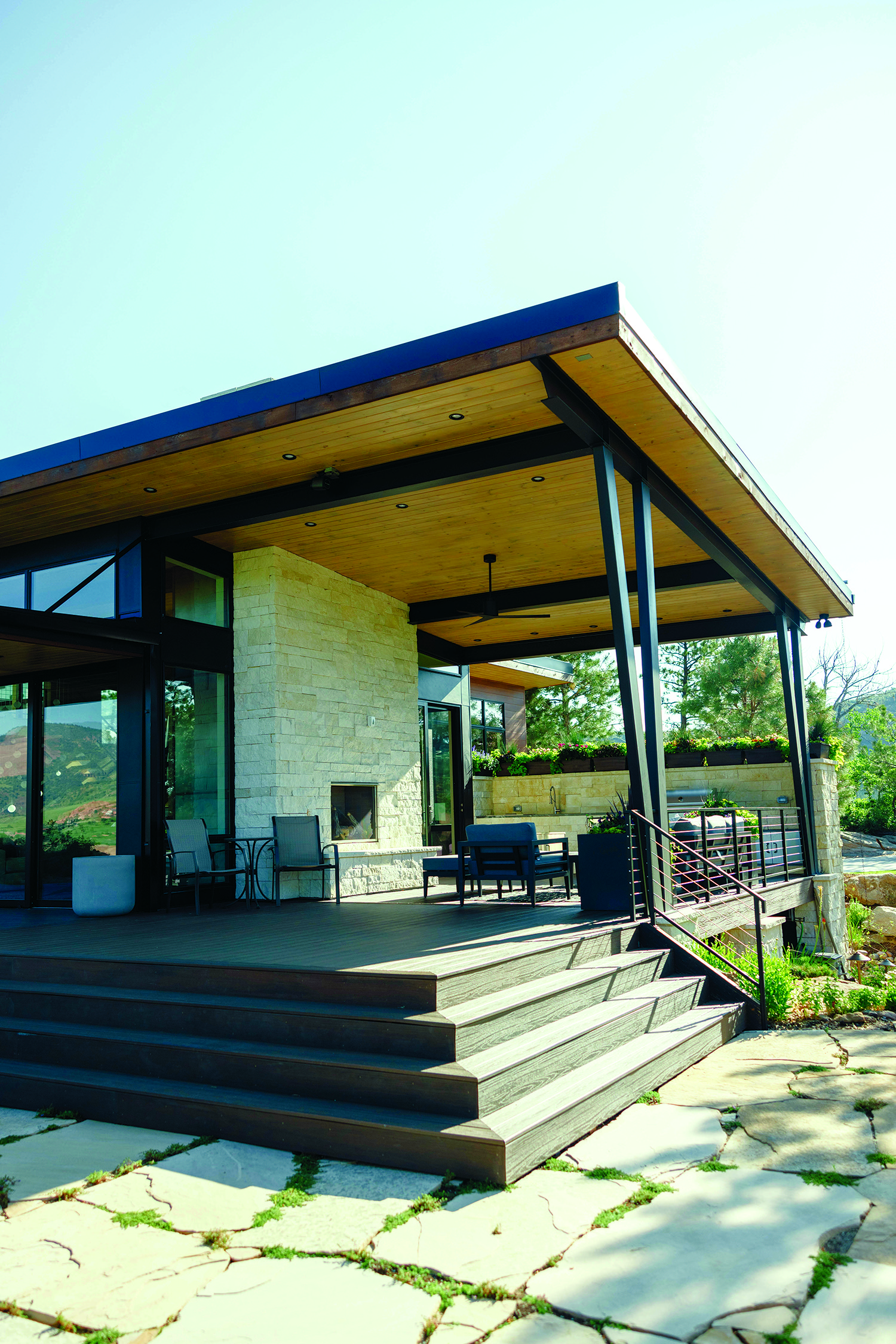 Covered Patio Outdoor spaces broaden the home’s living areas. A stylish fireplace allows for outdoor living in the colder months. | Photo: Alison Vagnini