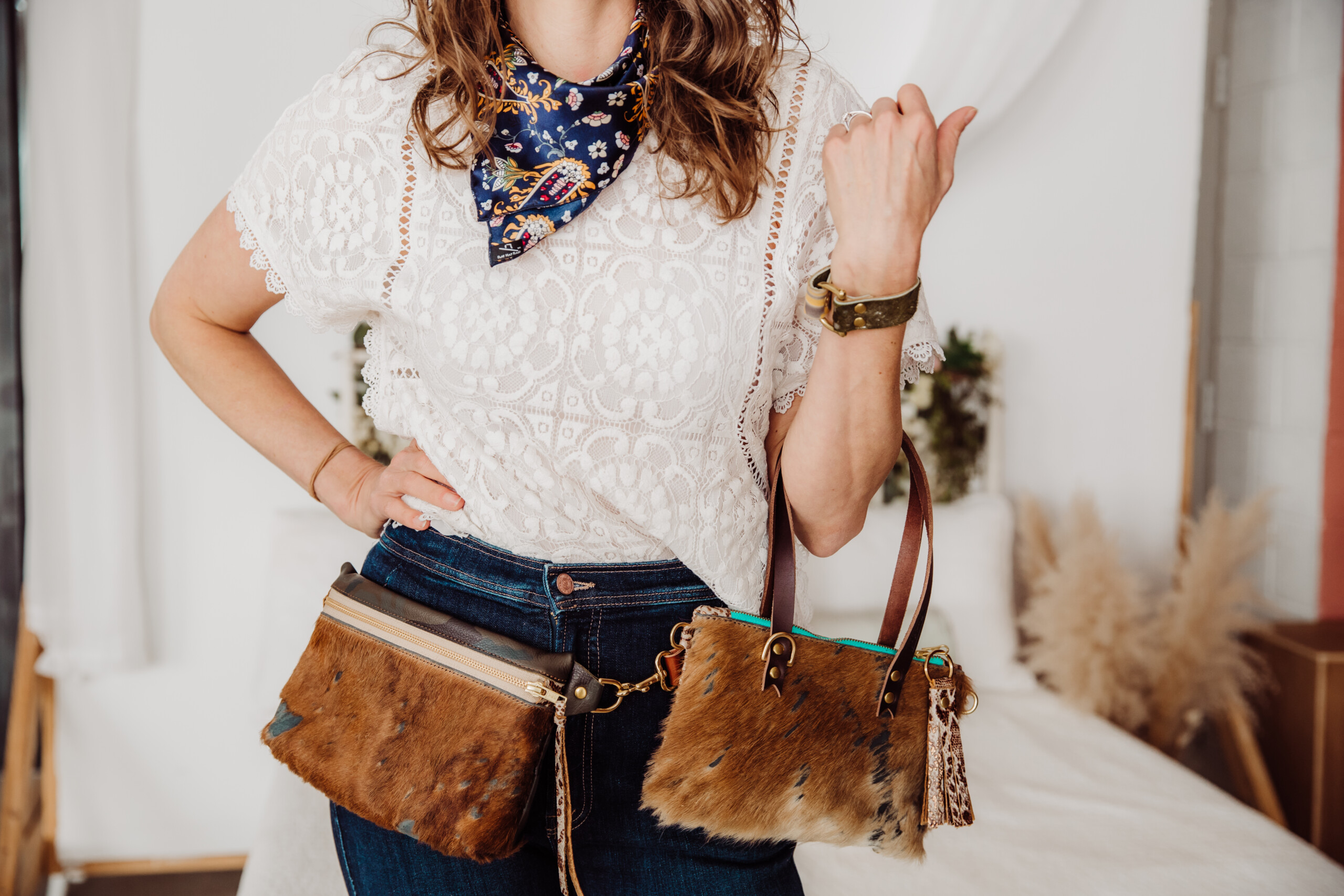 I used to hand select every piece of leather and materials and made bags that resonated with me based on the shape of the piece. Now, because we have gotten so busy, and since Ron joined the team, it is a collaboration where we both pick leathers and fabrics that we love and then pick a day where we spread everything out on our studio floor and pair the cowhide fronts with the smooth leather backs and match them with a fun fabric for the interior. For my really special Signature pieces, I dig out scraps and leathers that I have (sometimes) held on to for years until the time is right for them to become something that gives with where my head and heart are at in that moment. Ron has started helping with these by adding free form stitching to attach the different elements to the body of the bag, and between the design and materials, and the stitching, each Signature piece is its own amazing work of art.