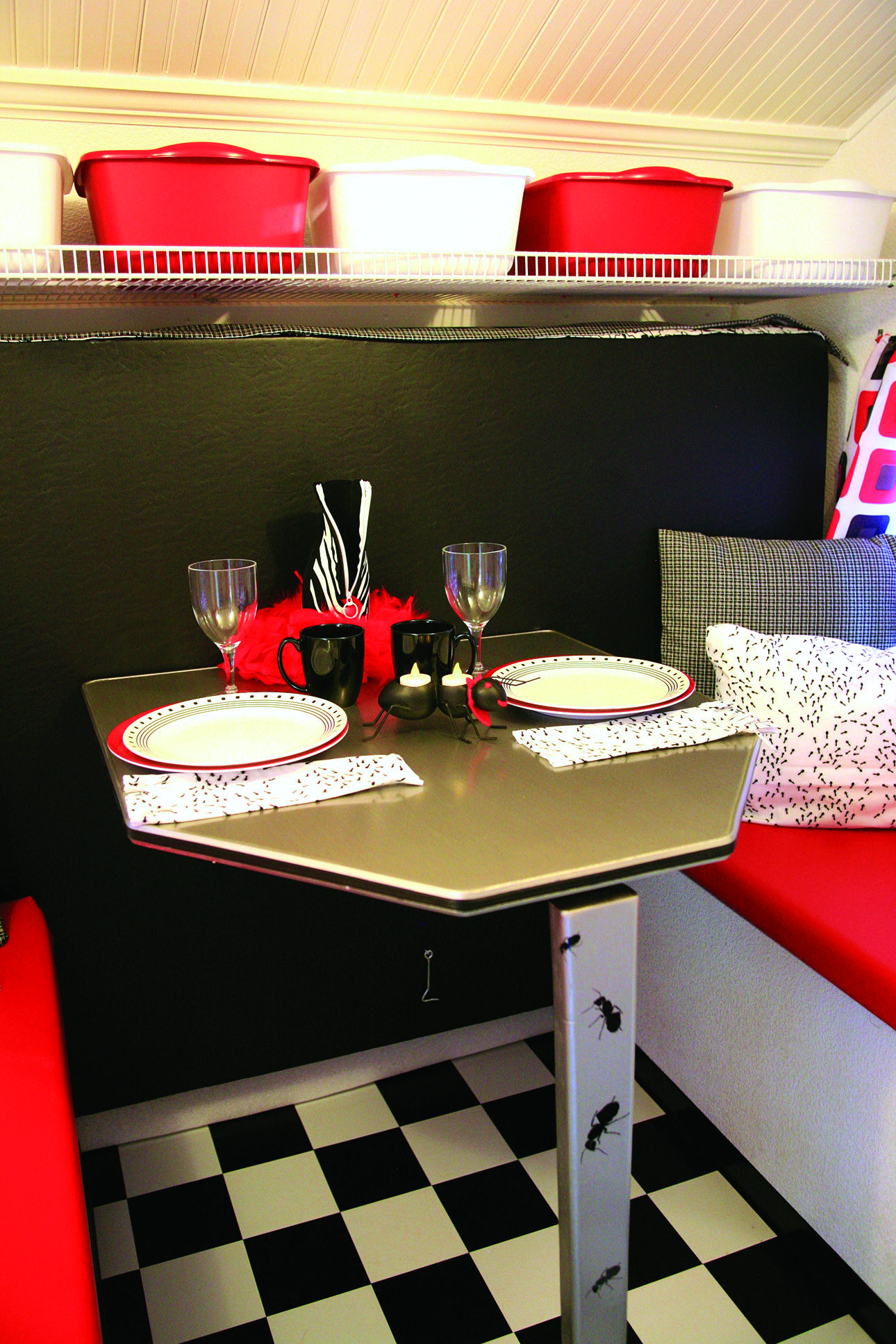 Bold red, white and black diner décor influenced the interior design of this trailer—called The Ant Bed Lodge. | Photo: David Foxhoven