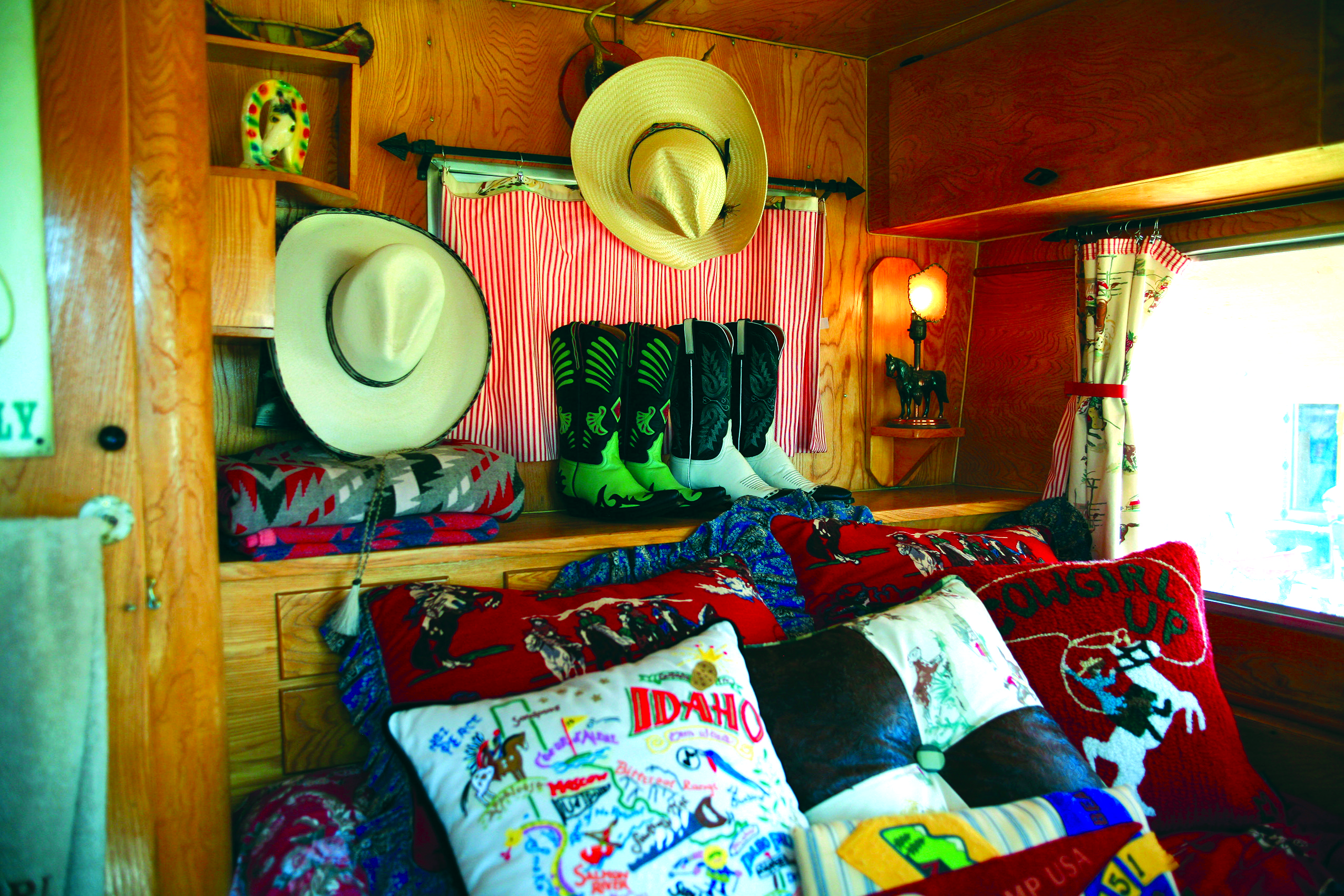 Warm red pillows and some of Becky Clarke’s (she’s Sister #2) cute cowgirl boots decorate the sleeping area of her trailer. | Photo: David Foxhoven