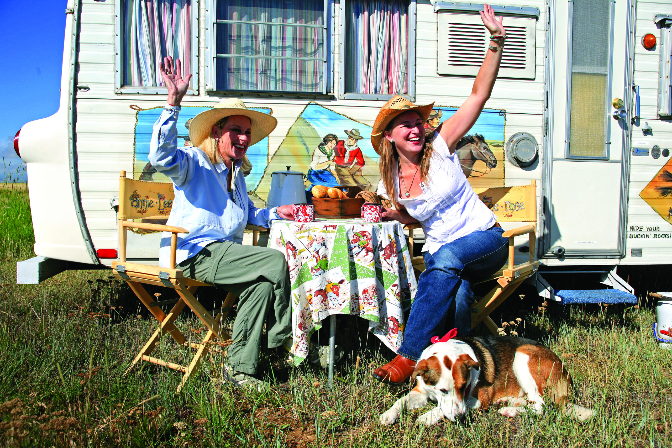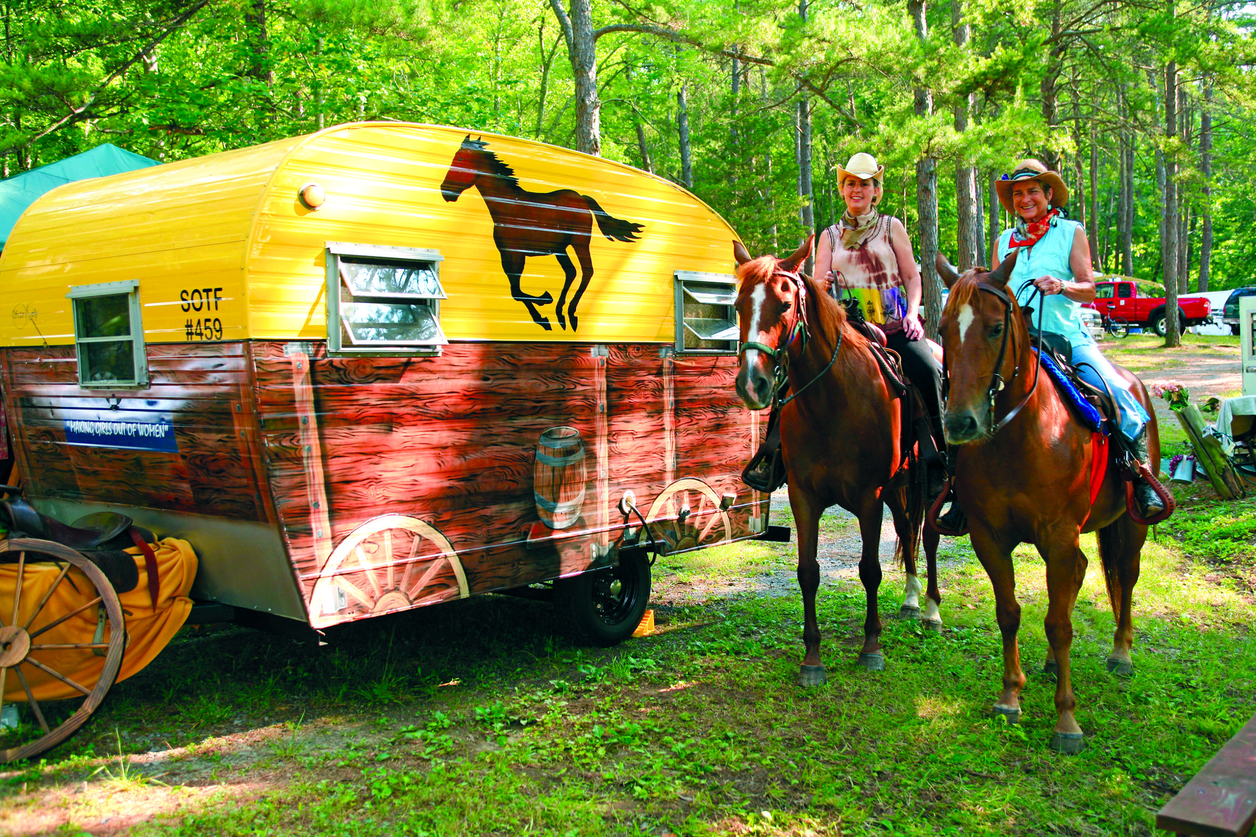 Next comes the fun part: choosing a name for the trailer. Calamity Jane, Mustang Sally and Prairie Rose are popular, but others include Glitter, The Bunkhouse, and Cowgirl’s Place. Members of Sisters on the Fly enjoy a play on words: Belle on Wheels, Porta Party, Patiwagon and Pair A Dice are some examples. One Sister calls her trailer The Ant’s Bed Lodge because “whenever you have an outdoor gathering, the ants come.”