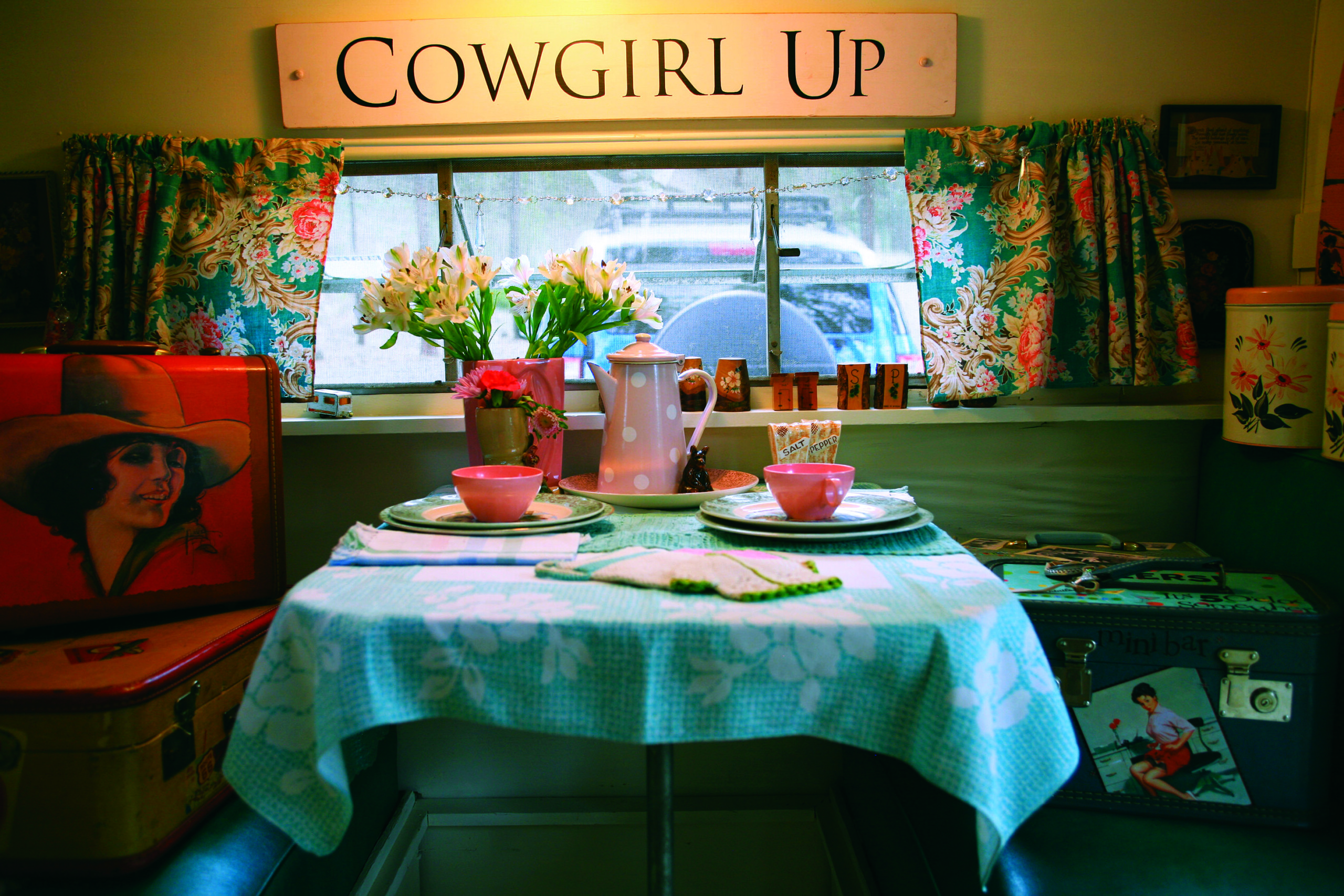 Many Sisters enjoy channeling their “inner cowgirl” when decorating their vintage trailers. Here: the dinette has a retro theme—a vintage tablecloth, bark cloth curtains and suitcases (great for storage) decoupaged with cowgirl decals. | Photo: David Foxhoven
