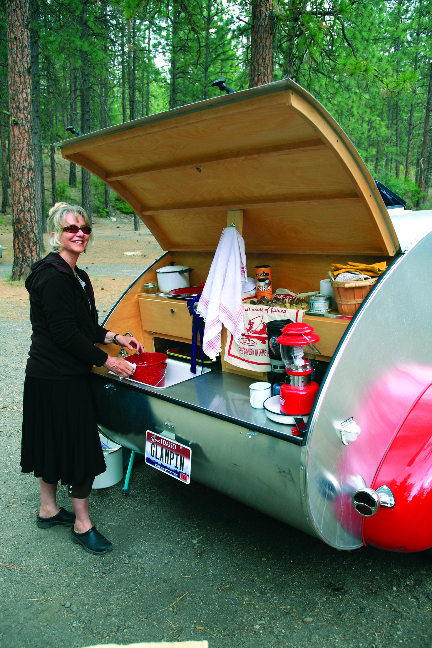 Mary Jane Butters cooks dinner in the teardrop she originally designed for Robert Redford. | Photo: David Foxhoven