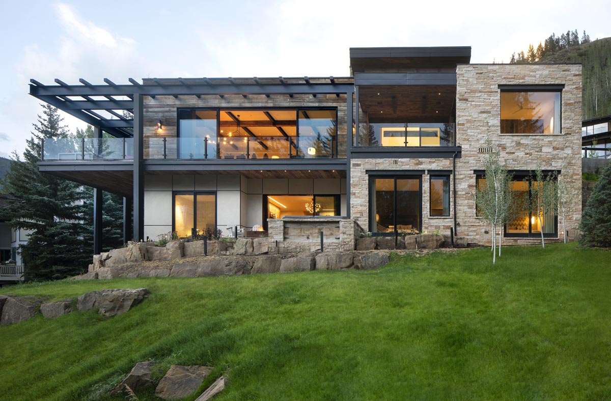 The exterior of this mountain home exemplifies two key features of modern design: clean lines and rectangular forms. Clean lines contribute to a sense of order, balance, and harmony, while rectangular forms provide functional separations and add a touch of symmetry and balance to the overall design