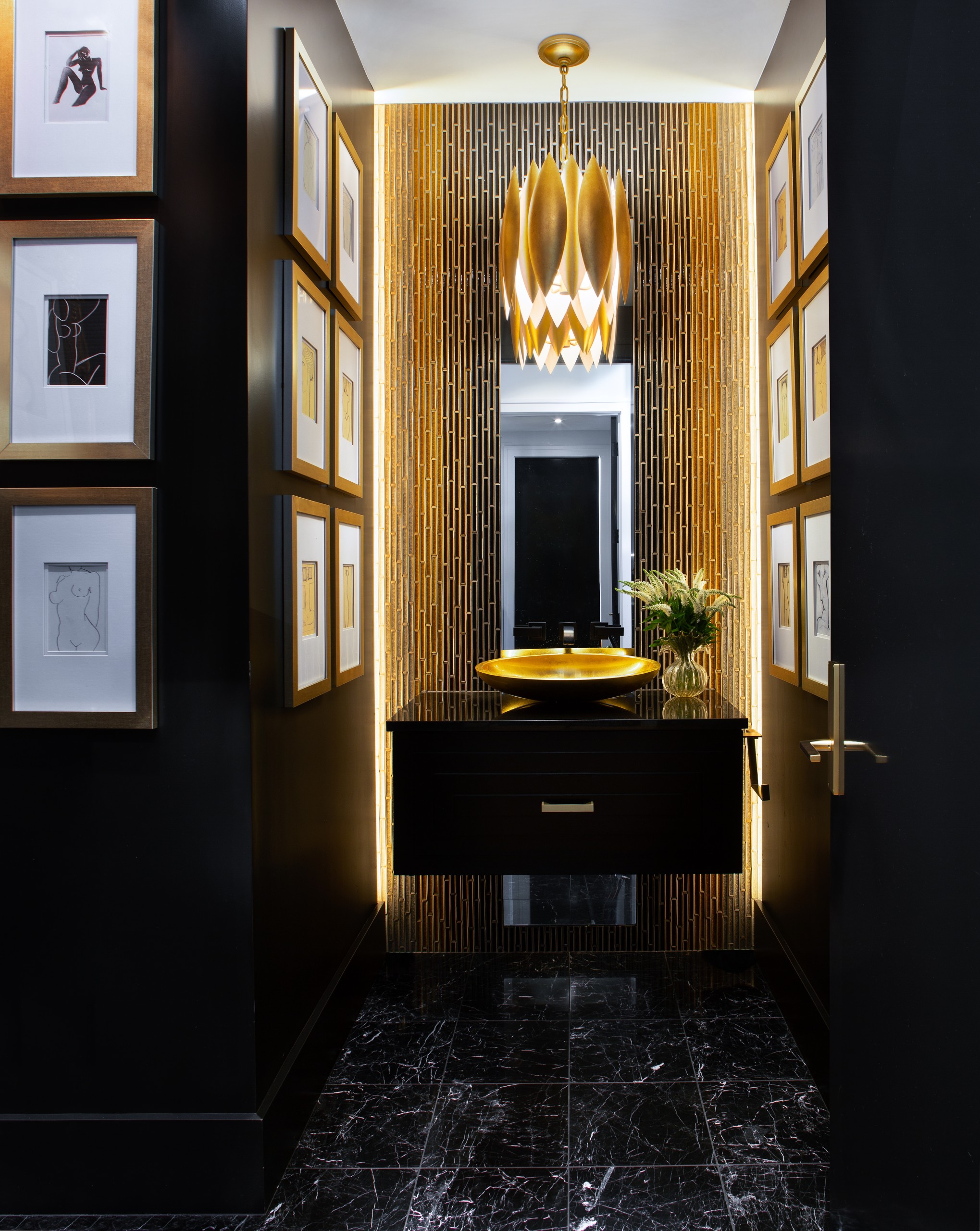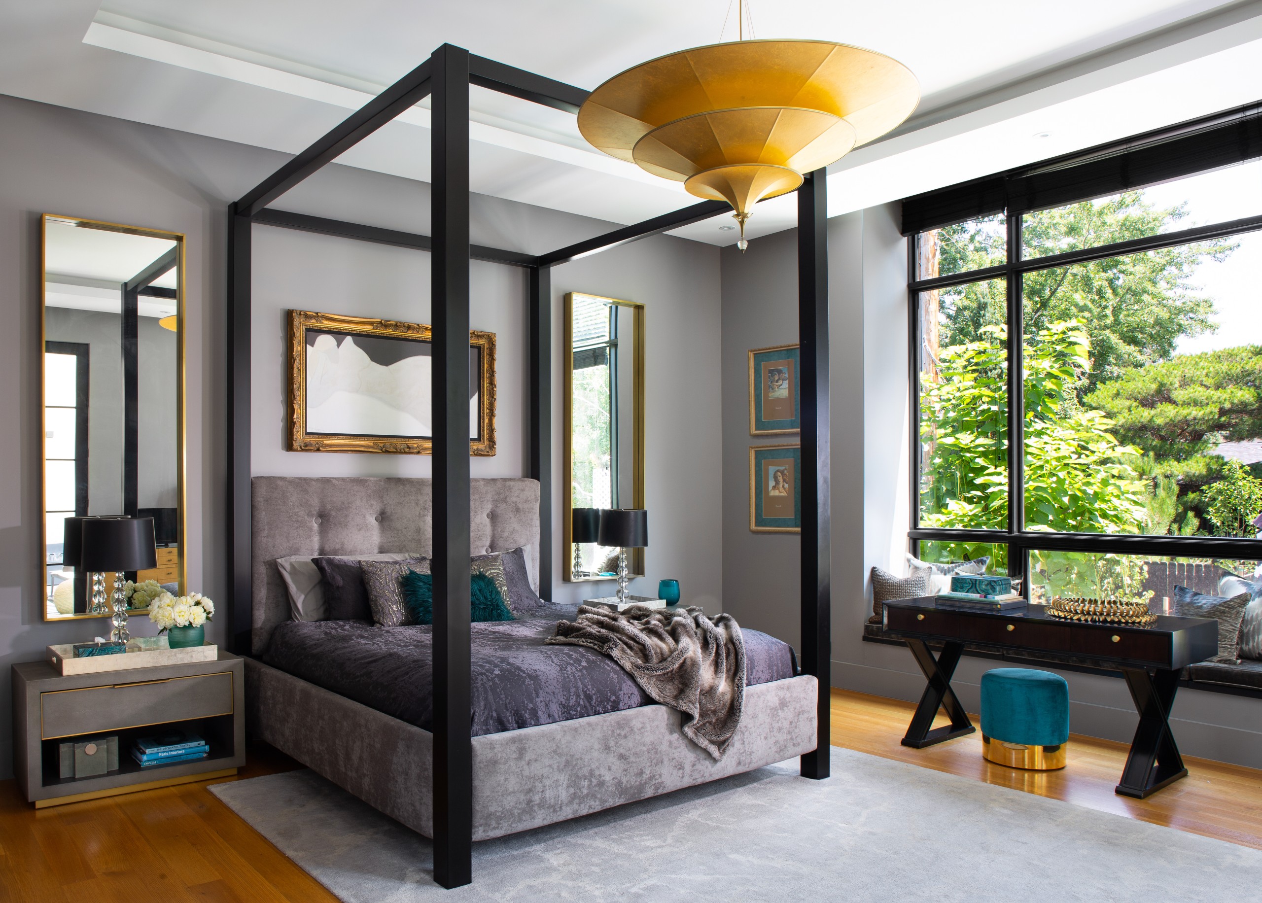 The homeowner’s affinity for glamour continues in the primary bedroom, where the four-poster bed with a luxurious gray velvet frame is seductively lit by a gold Fortuny chandelier, and deco-inspired Venetian blinds make beautiful shadows. “The room has that sexy Hollywood feel,” she says.
