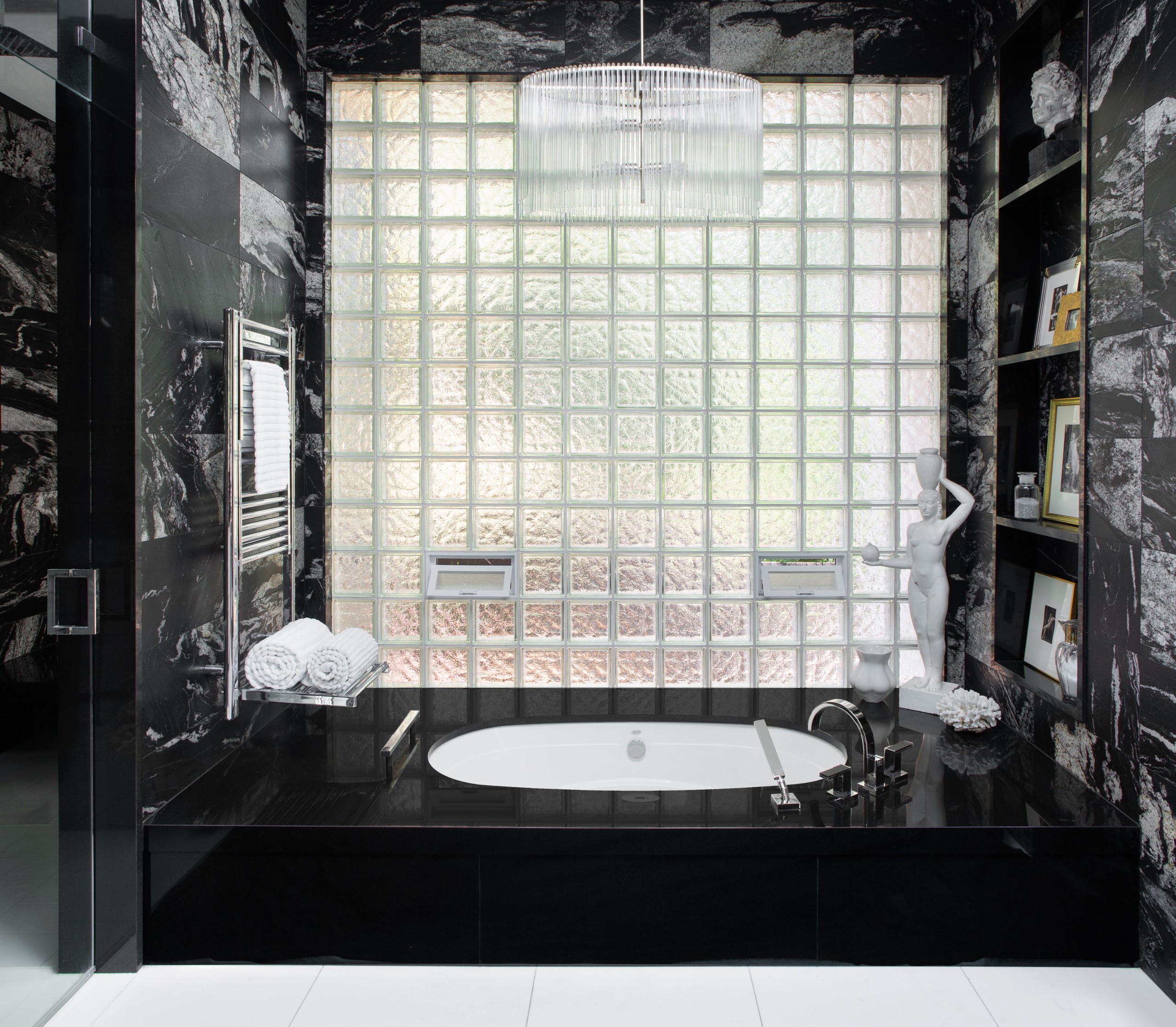 Nero Athens vein-cut brushed granite wall tile, milk glass floor tile, an absolute granite tub surround and a glass block wall invoke the art deco era. The tub hardware is by Delta.