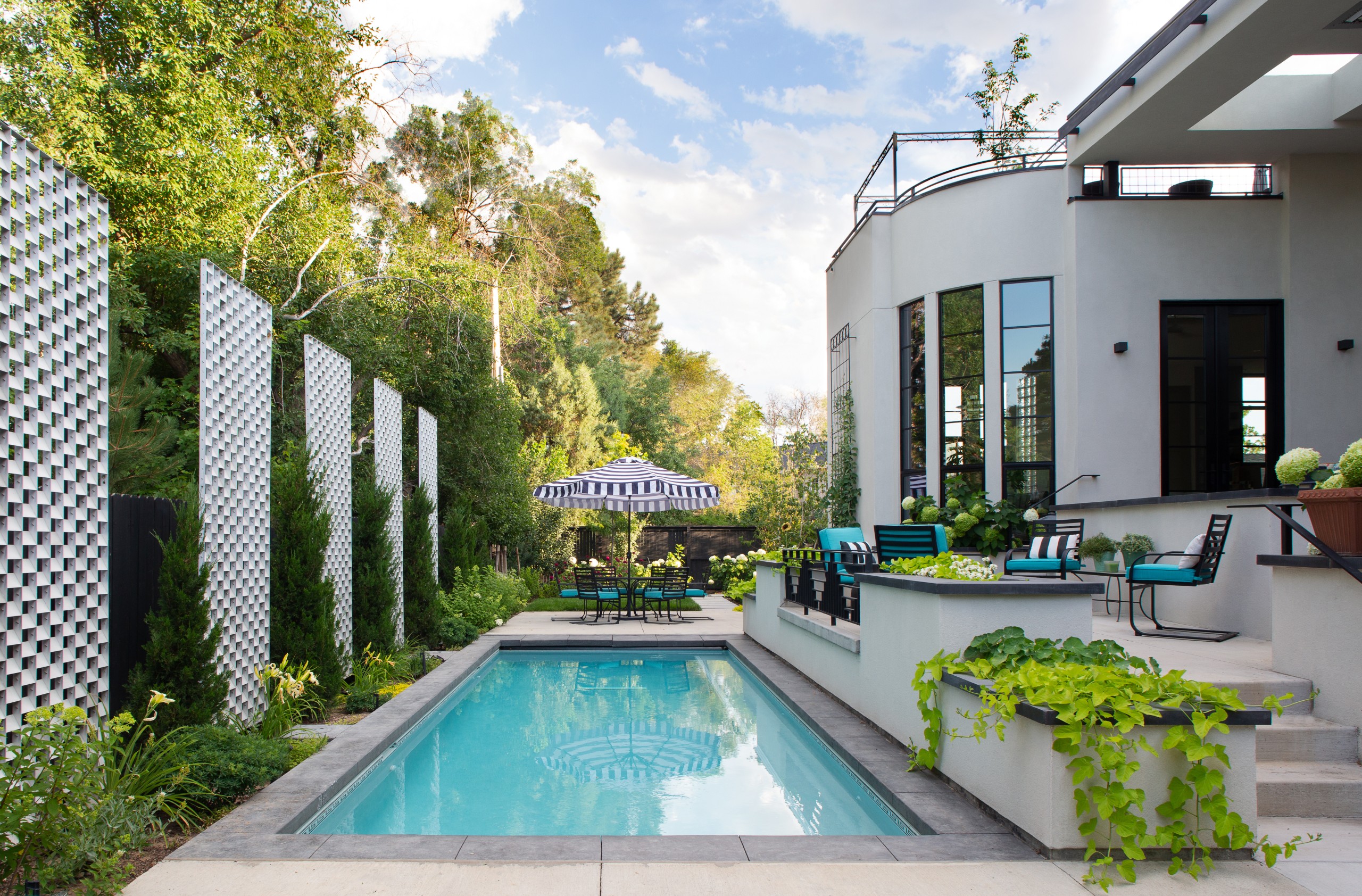Multi-level terraces step down to the swimming area, and turquoise cushions on the patio furniture take their cue from the sparkling blue water. “It’s like living on the Amalfi Coast,” enthuses the homeowner. The privacy screens were salvaged from the Cherry Creek post office renovation.