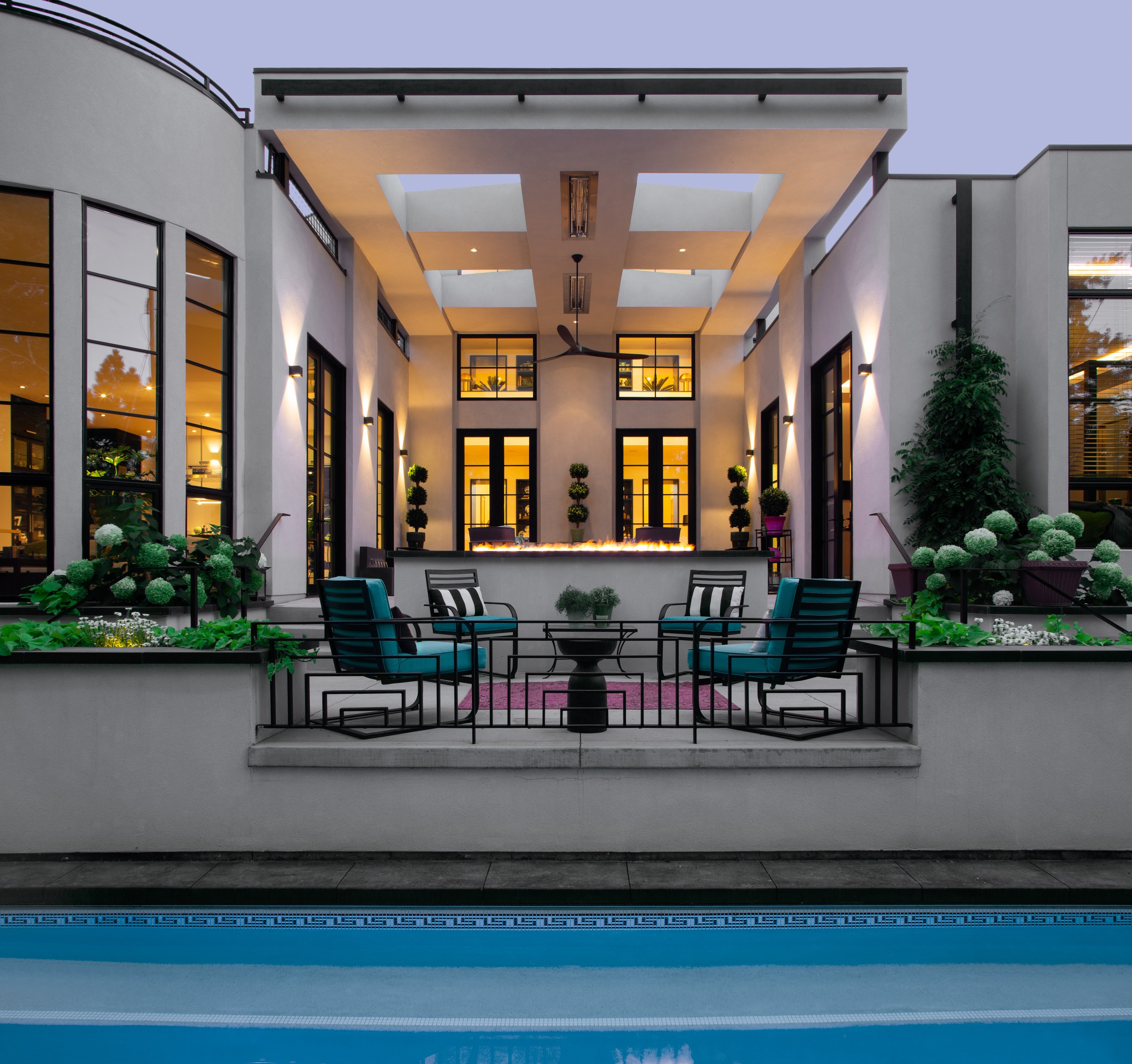 Along with the dining room and kitchen, the primary suite has doors that open to the courtyard. There, an oversized fire pit makes dining al fresco a three-season affair, and terrace seating overlooks the swimming pool. Alissa Shanley and Christopher Silkwood of B. Gardening Landscape Design selected the greens and whites of Annabelle hydrangea, Chanticlear pear trees and sweet potato vine as perfect complements to the turquoise water.