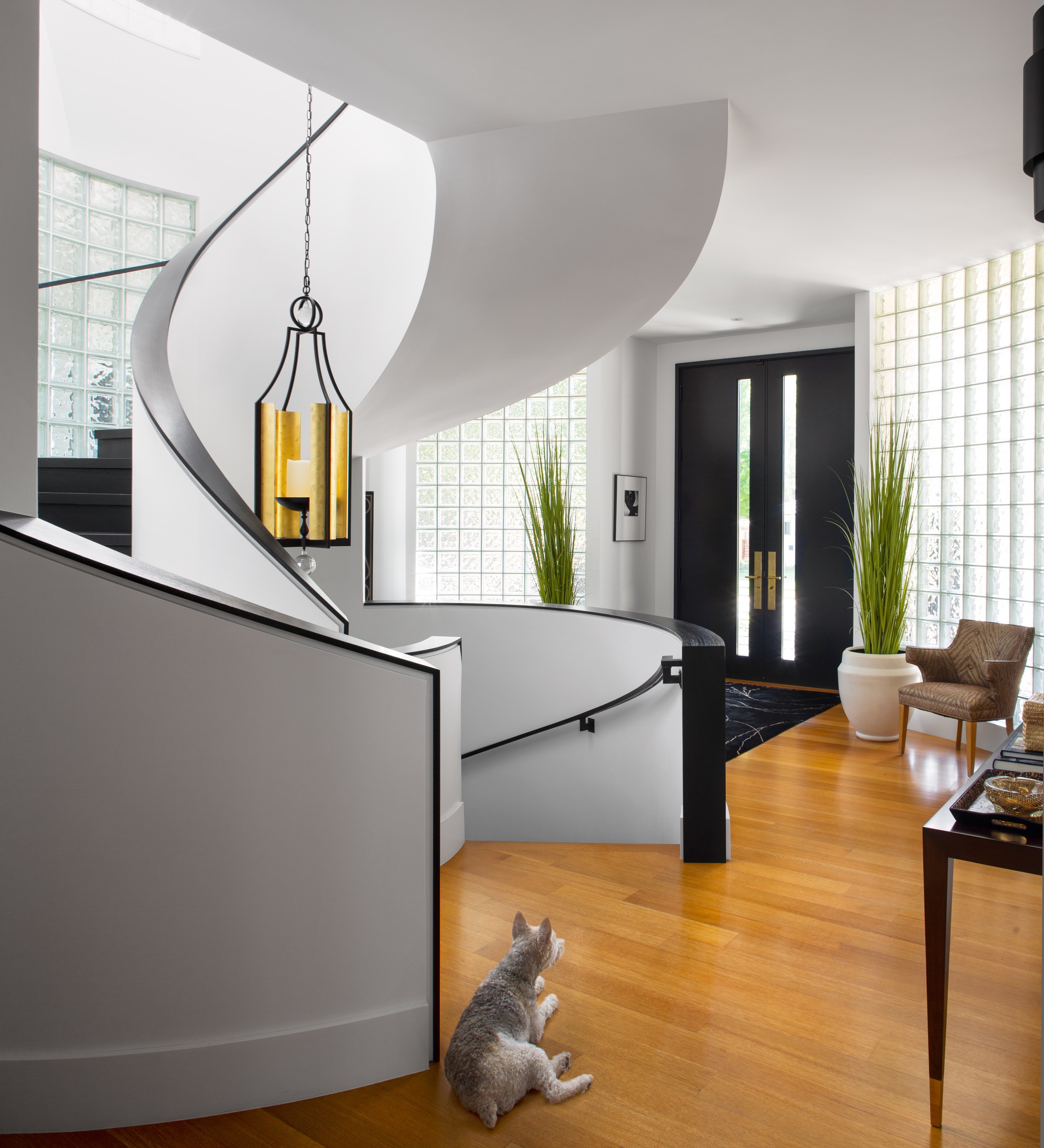 Inside, the requisite glamorous tone is established in the entry foyer, where a circular wall composed almost entirely of glass block encases a grand spiral staircase. As Parker shares, “It took several iterations to make sure the glass block actually worked in the radius we created, and the staircase itself needed to be craned in through the roof.” That challenging maneuver fell to builder Chris Withers of Old Greenwich Builders, who explains, “You have to drop the staircase in before you set your roof trusses. If you don’t have the sequence just right, you’ll end up having to pull things apart.”