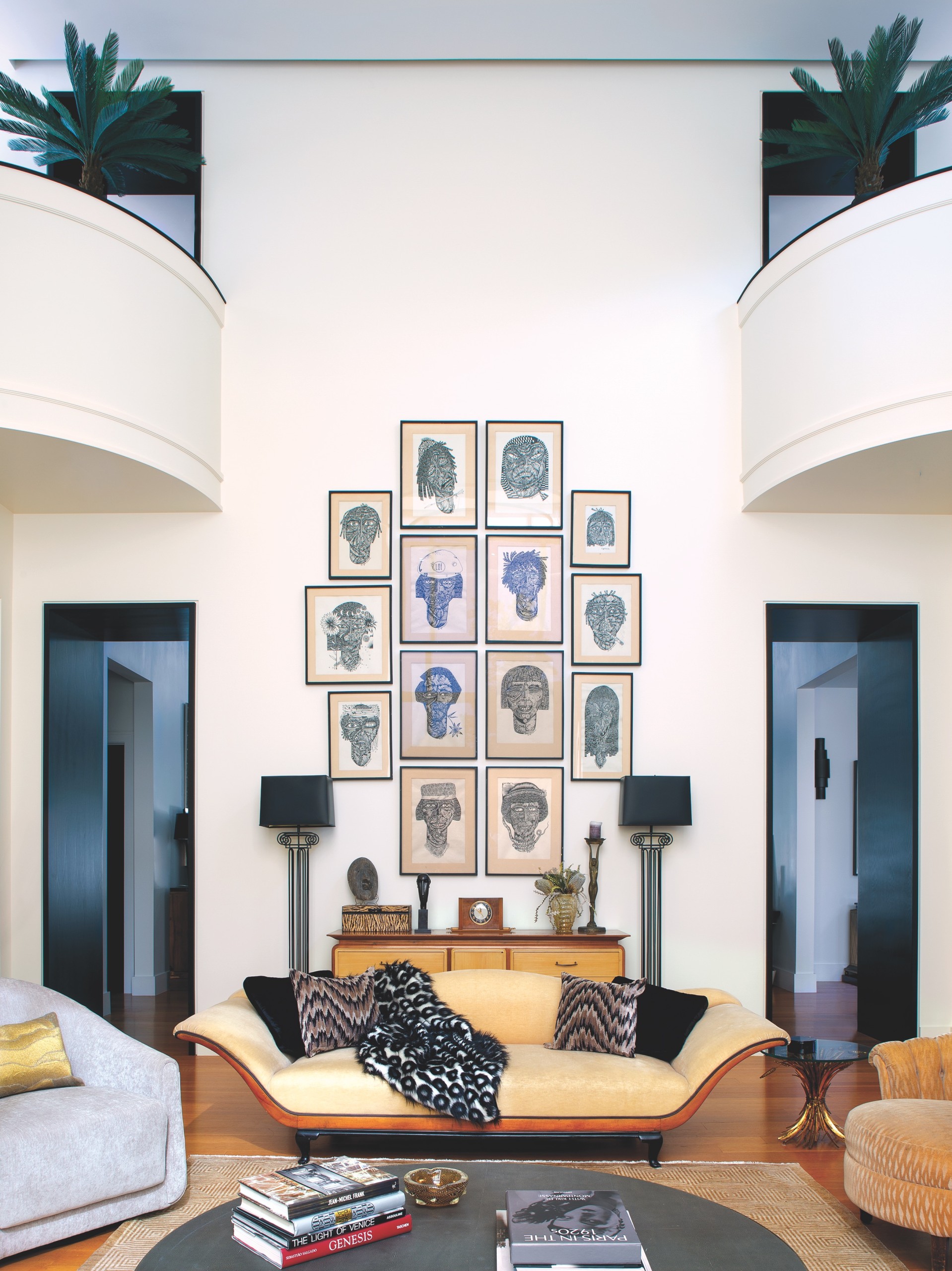 “Before we moved in, I often found myself literally designing rooms in my head around my existing furniture,” says homeowner Terri Garbarini whose extensive collection of art deco pieces inspired the architecture and interior design. Throughout the house the rooms were designed around her artwork including this grouping of African drawings.