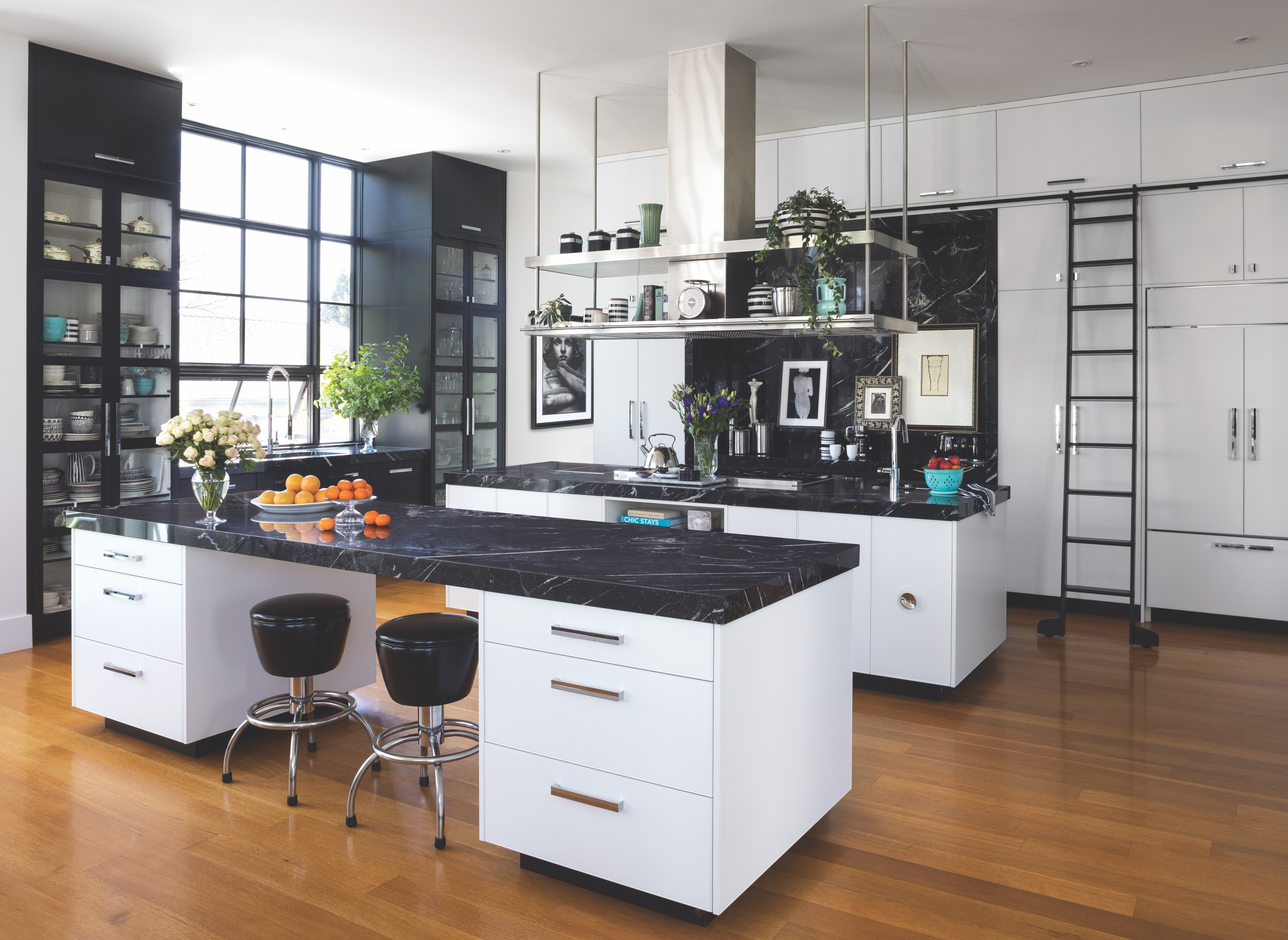 Polished Skyfall granite tops the islands, and the cabinets, all wearing Belwith Keeler hardware, are by Aspen Leaf Kitchens Ltd. The main sink faucet is Dornbracht and the prep sink version is by Moen.