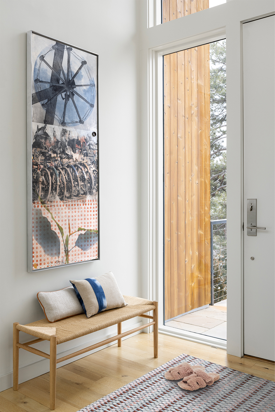It’s about focus and intention, about feeling the light within ourselves.” After that, they moved into the actual design process, looking at meaningful, sacred elements to bring into the design. “The art was a big factor for Taro and Amy; a lot of it includes imagery of bicycles, which are big for Taro, who is an avid cyclist,” says Tenzin. “And they also were interested in pieces that were handmade, more natural or sustainable.” Says Ippoliti, “When you walk in the front door, you walk into the see-through staircase that looks out onto the whole back wall of glass. It’s kind of a see-through house. “It’s like a reimagined Midcentury Modern home. All of the glass brings nature close by, so you almost feel like you’re floating outdoors.”