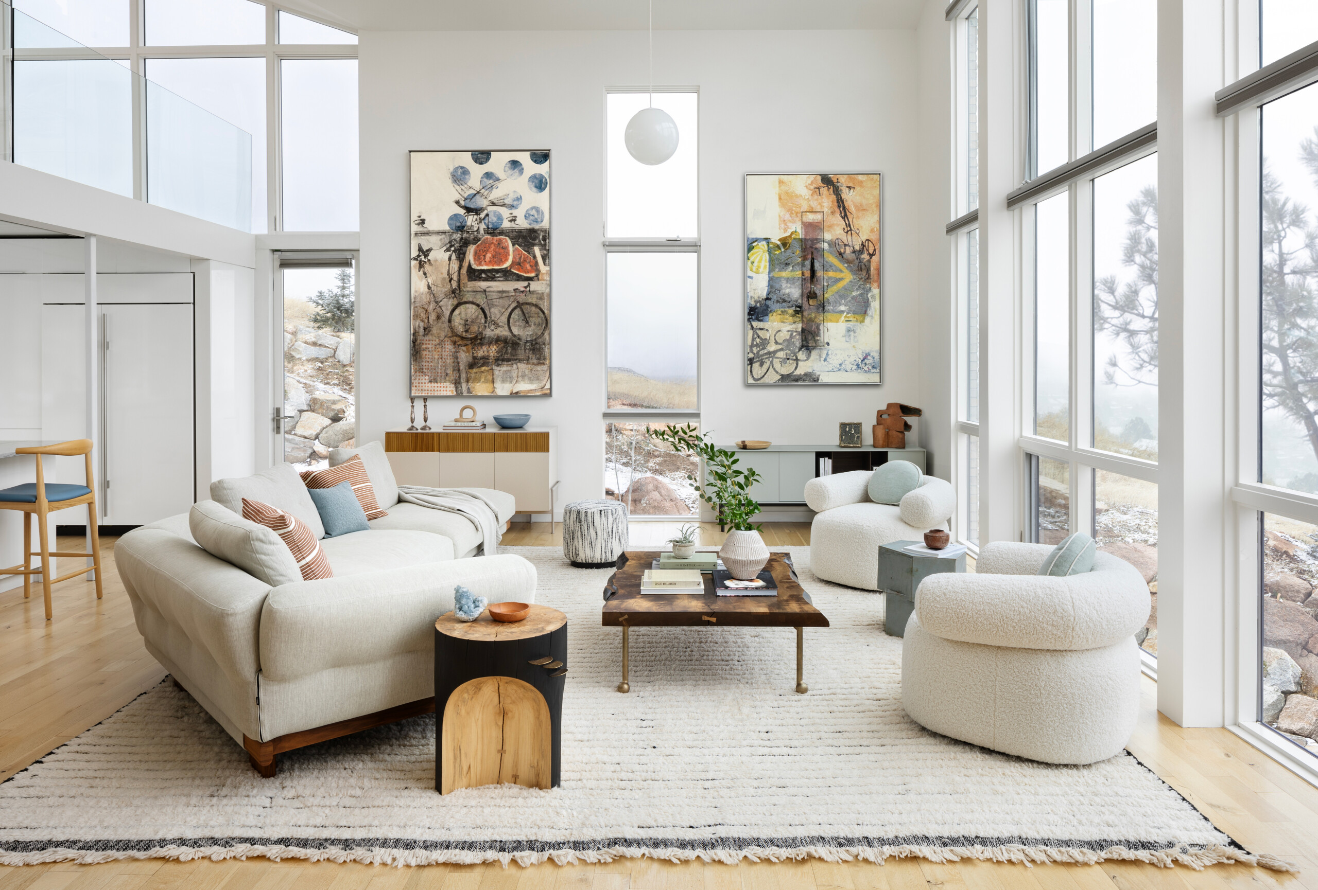 Living Room The new back windows are 70 feet long and 20 feet high. The Sengu sectional, from Denver’s Studio Como, is made of recycled materials, and the rug is from a Moroccan women’s rug weaving collective and is all-natural wool. | Photo: Kimberly Gavin