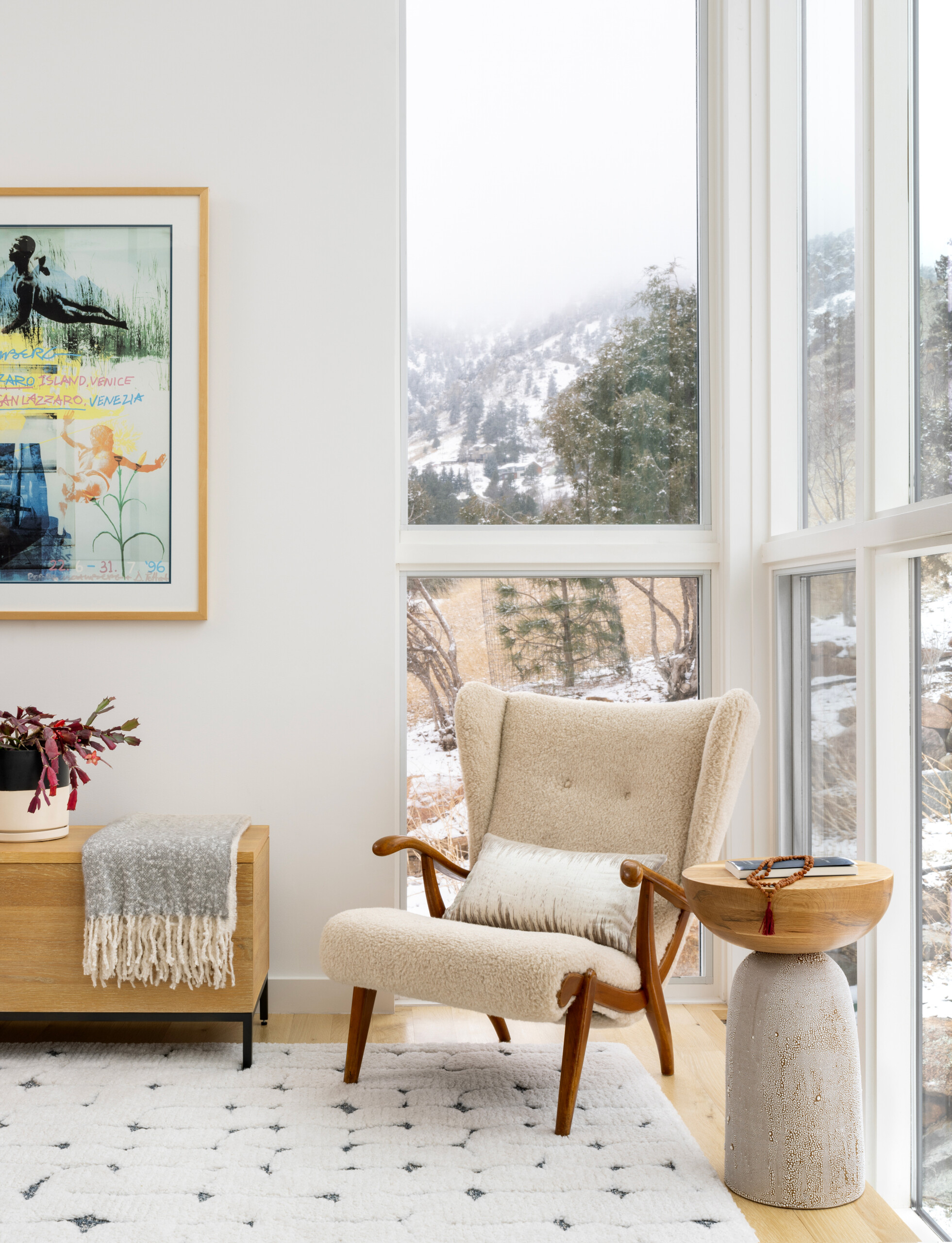 Wellness. Spirituality. Sustainability. A connection to the outdoors. These are the key design elements showcased in this North Boulder remodel, a project by Home Within, a wellness-focused branch of Joe McGuire Design. The owners, famed yoga teacher Amy Ippoliti and her husband, Taro Smith, a visual artist, photographer and wellness consultant, opted first for an architectural redo. The original house, a 1971 ranch with full-height front windows overlooking downtown Boulder, was reimagined by Brad Burch of Index AD. Burch reconfigured over 80 percent of the original exterior with all-new interiors, including three bedrooms, three bathrooms, an elevated yoga loft and an art studio.