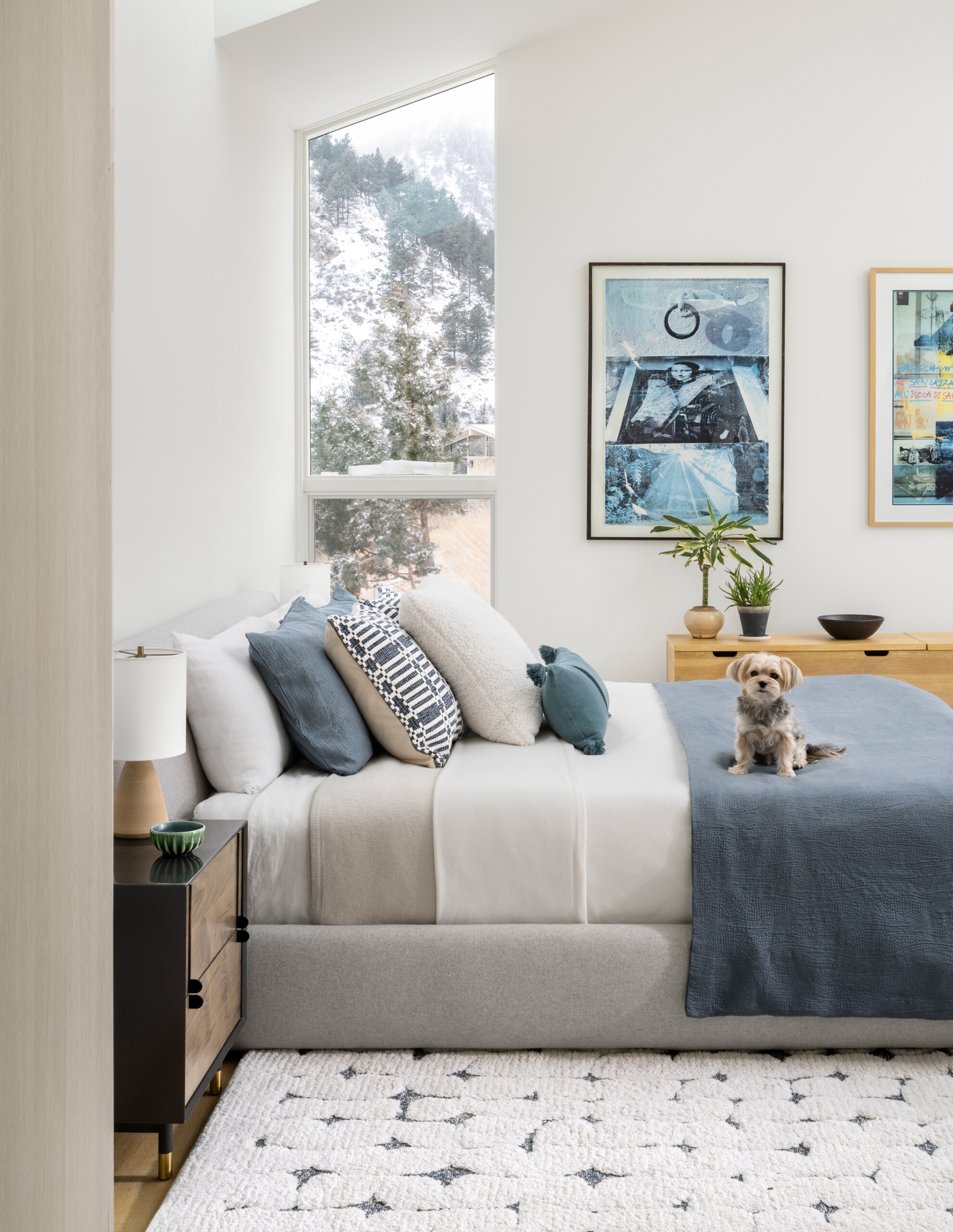 Main Bedroom The homeowners’ bedroom is also elevated to create the feeling of a sleeping pod. The EQ3 upholstered bed is surrounded by BDDW nightstands, with Victoria Morris table lamps. | Photo: Kimberly Gavin