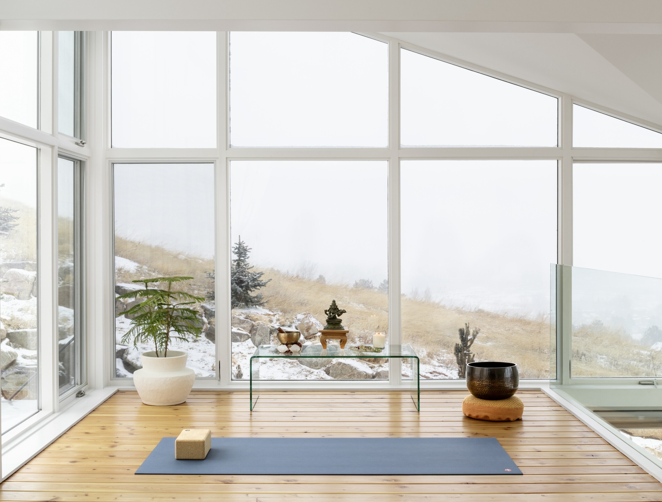Yoga Space Architect Brad Burch was able to design a loft yoga studio for Ippoliti, elevated above the kitchen. “It’s in the back of the house, against the hillside, so the field is almost a canvas on that wall,” says Burch. “We were able to get real openness without privacy concerns.” | Photo: Kimberly Gavin