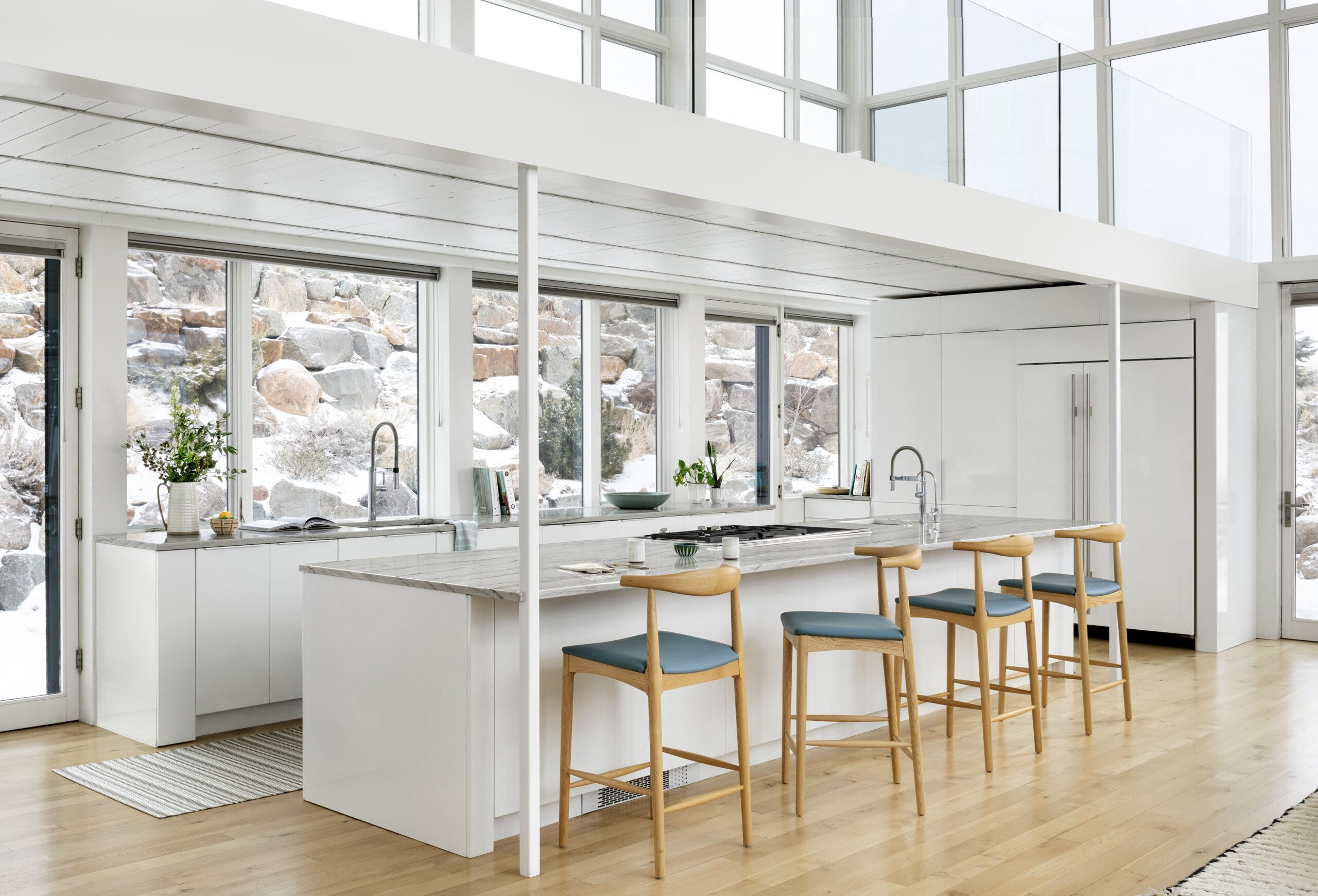 Kitchen The kitchen, with custom acrylic cabinetry, was moved to the back of the house, facing large windows—perfect for watching the parade of wildlife outside. “We wanted to bring in a lot of light and to maximize the views,” says Ippoliti. “Because we do a lot of informative nutritional videos, we also wanted a kitchen we could use for filming, with ample counter space.” | Photo: Kimberly Gavin