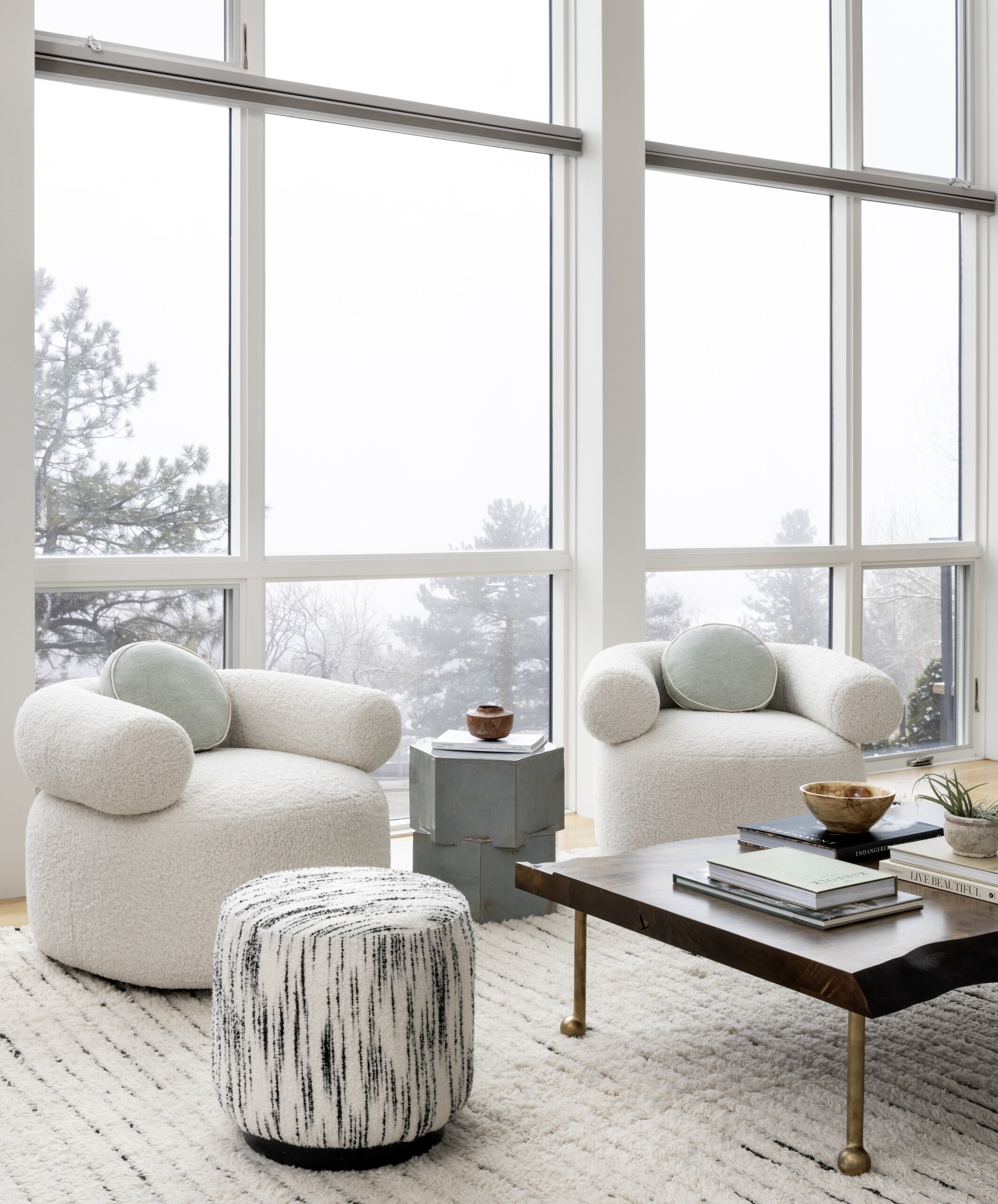 Sitting Area The living room includes Huggy swivel armchairs by Ellison Studios; a ceramic side table by Bari Ziperstein, Los Angeles; a Kneedler Fauchère custom ottoman; and a one- of-a-kind coffee table by BDDW. | Photo: Kimberly Gavin