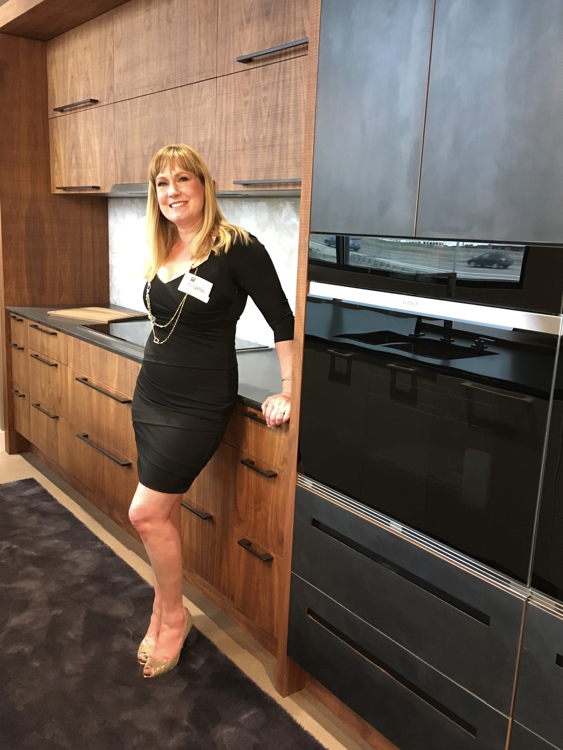 Angela Otten, kitchen designer and owner of Inspire Kitchen Design Studio, is pictured in her Denver IDC showroom. The kitchen model depicts an industrial look with a combination of textured walnut veneer cabinets and cold-rolled steel doors. | Photo courtesy Inspire Kitchen Design Studio
