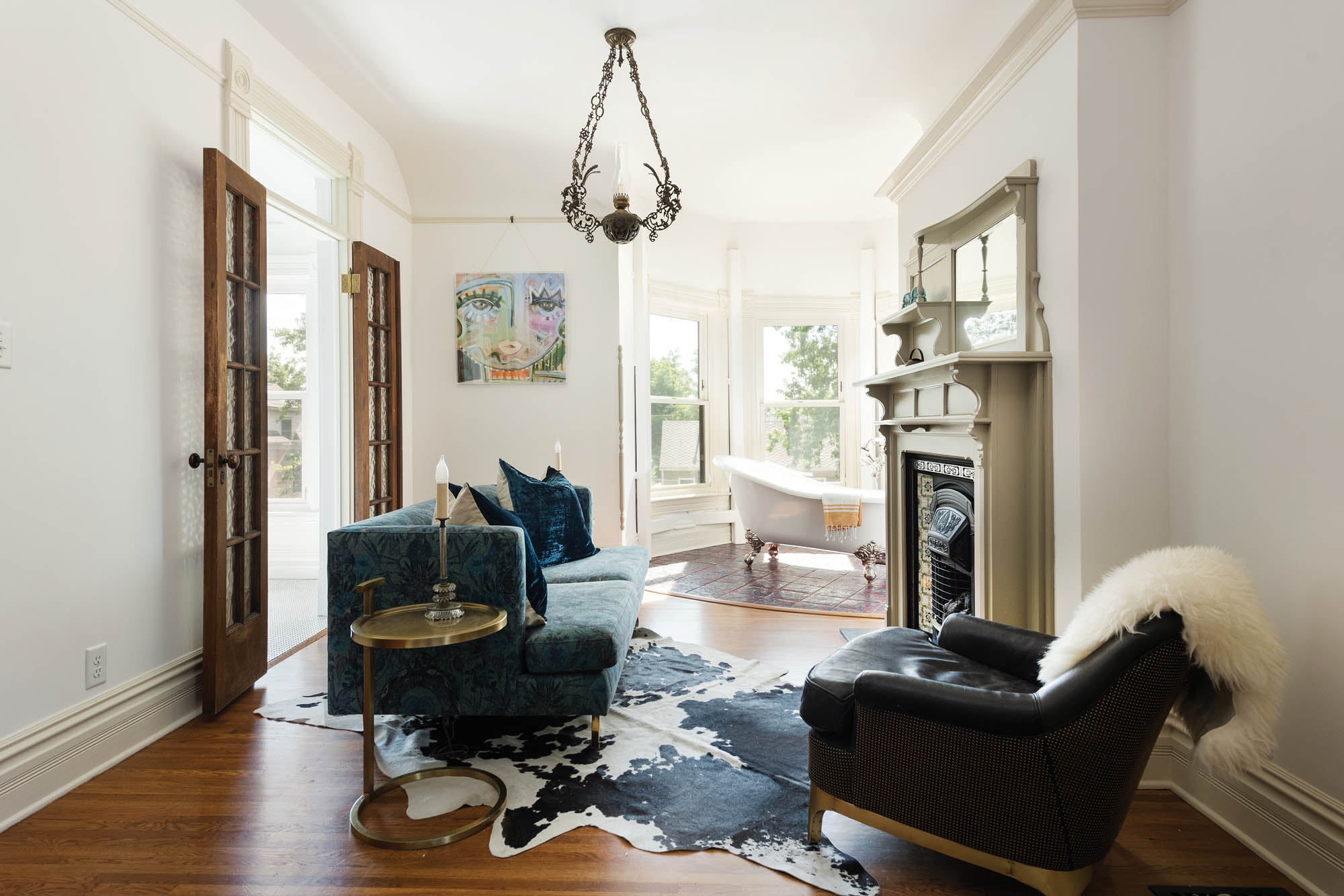 The original bath (shown here) adjoins the tub room through the double doors. “There wasn’t room for a separate tub and shower in the bathroom,” says Slade, “and since a bathtub is a must for me, I decided to give it a prime spot in the turret.”