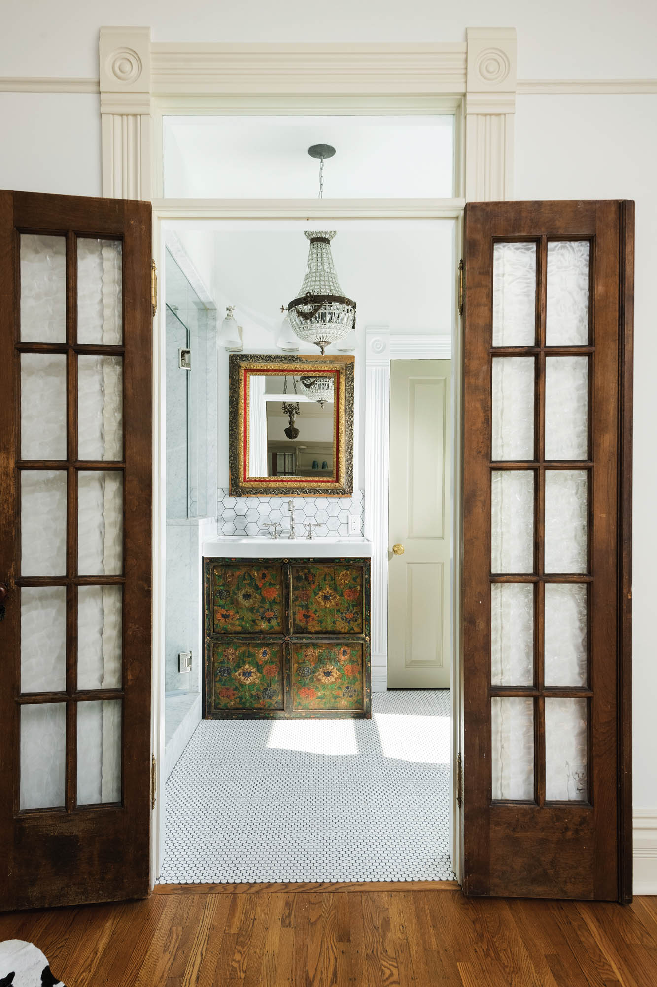 RESOURCE GUIDE The vanity is a hand-painted antique Tibetan cabinet to which the owners added an integrated counter and sink; Rohl Arcana Widespread Italian Lavatory Faucet; mirror and chandelier were antique store finds; Restoration Hardware Bistro sconces. {Header image above}: Clawfoot Shropshire Slipper Bathtub from Victoria and Albert; Sign of the Crab Freestanding Faucet with Telephone Sprayer by Strom Plumbing