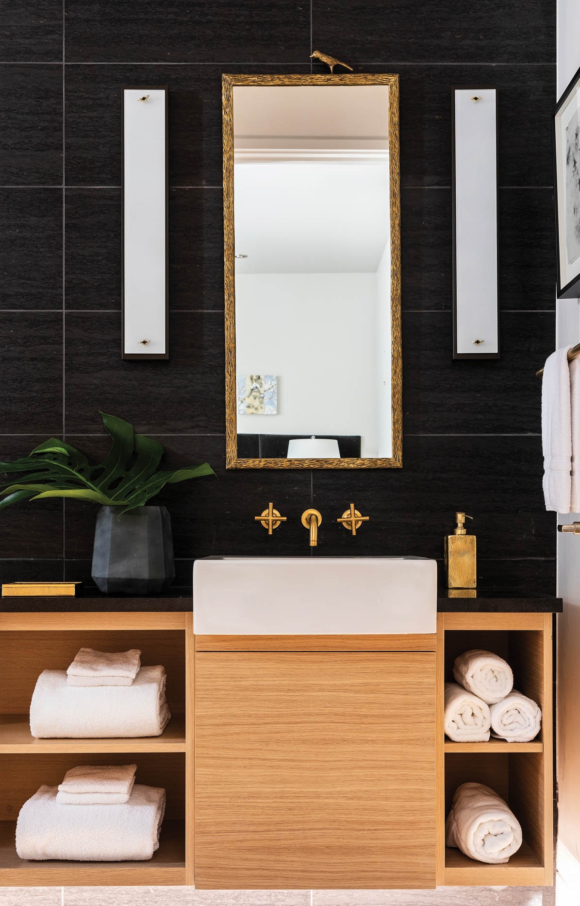 To achieve that balance, Eyles juxtaposed strong black marble tile and white walls with natural wood cabinets and hardware with a warm finish. “The contrasts are sharp, and yet the space comes off as warm and welcoming because of the rich textures and brassy-gold accessories,” says Eyles.