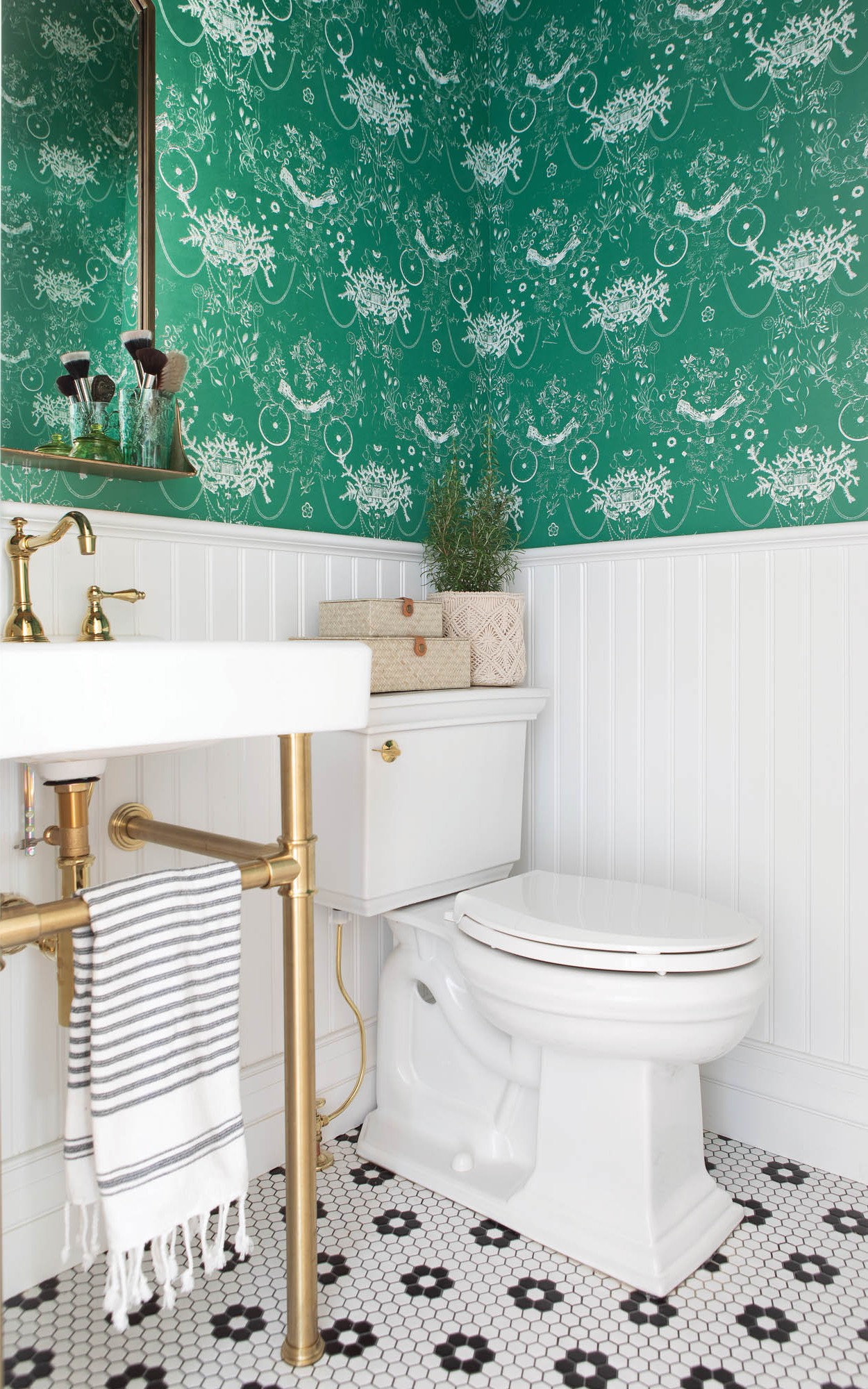 RESOURCE GUIDE Denver Damask wallpaper by WallTawk; Metal Arch Shelf Mirror by West Elm; Hex Matte White with Black Flower Porcelain tile from The Tile Shop; Console Pedestal with Fauceture Concord 20” Console Sink Basin from Kingston Brass; Forever Brass Widespread Lavatory Faucet by Newport Brass and Kohler Memoirs toilet, from Dahl Distributing