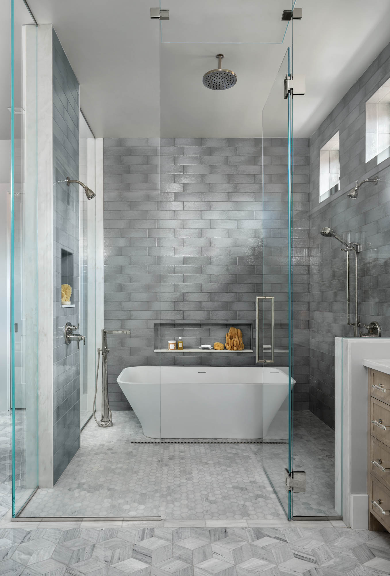RESOURCE GUIDE In the wet room: MTI 66” Soaking Tub in Matte White and Brizo Tub Faucet Trim Kit in polished nickle, both from Ferguson; Maiolica Grigio Glossy 4”x12” wall tile by Iris Ceramica and 2” Ash Gray Honed Hex floor tile, both from Pinnacle Flooring in Denver; Brizo Shower Head (D81398PN) and Slidebar Mount Hand Shower (D88798PN), both in brilliance polished nickel and from Ferguson. Sink area: White Oak, 12-ply dovetail cabinet by Aspen Leaf Kitchens Limited; countertop is 2cm honed Cremo Delicato, and floor tile is Origami Burokku 6” Polished in ash gray, both from Pinnacle Flooring