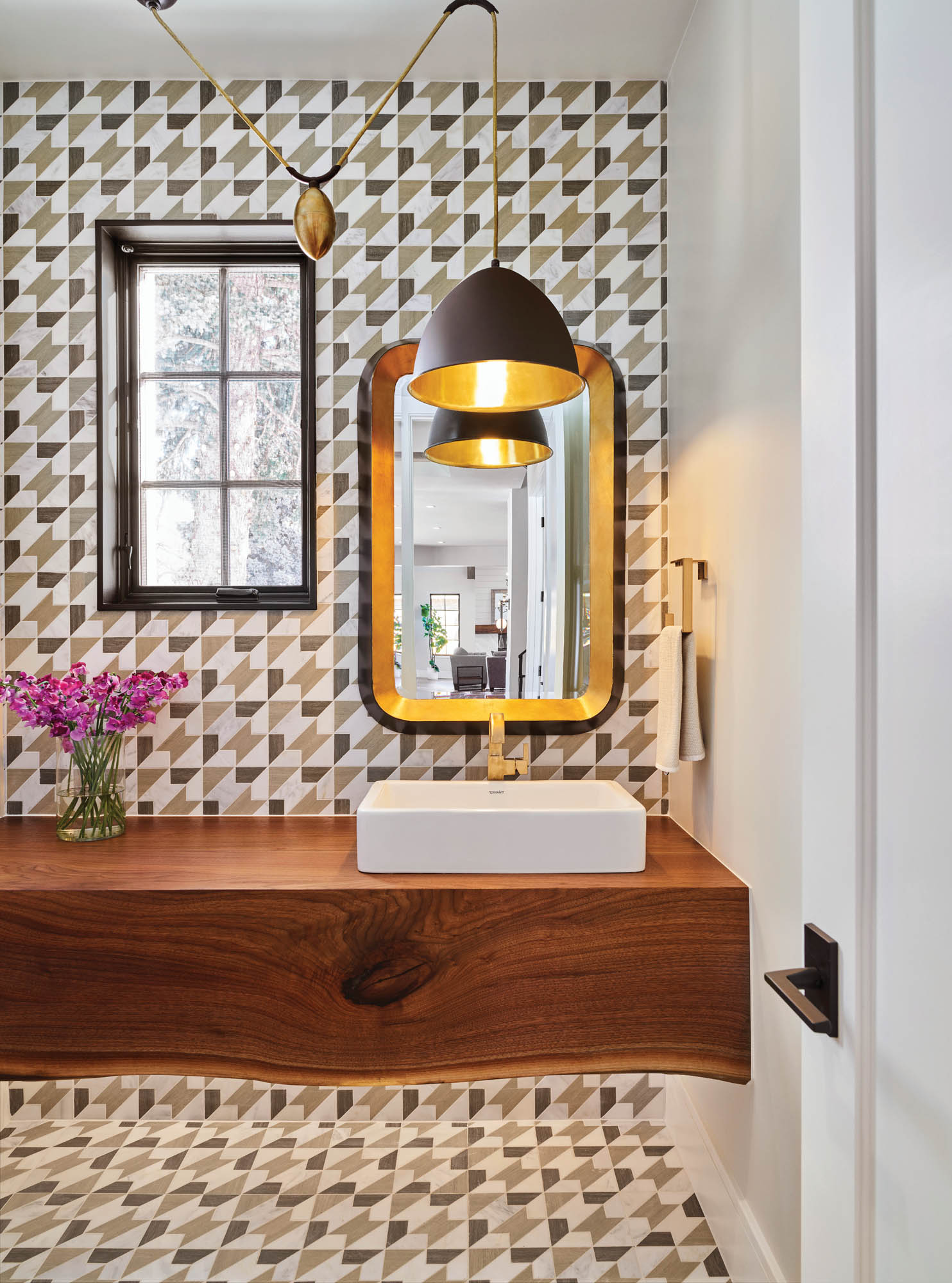 RESOURCE GUIDE Houndstooth Carrara Blend Marble Mosaic tile by Viviano Marmo from Floor & Décor; Niva Mirror by Uttermost and Egg Drop Pendant by Arteriors, both from FUSION Light & Design; Duravit Vessel Sink and Delta Vero Vessel fixture, both from Ferguson; custom walnut counter by Eden Oaks Designer Woodware