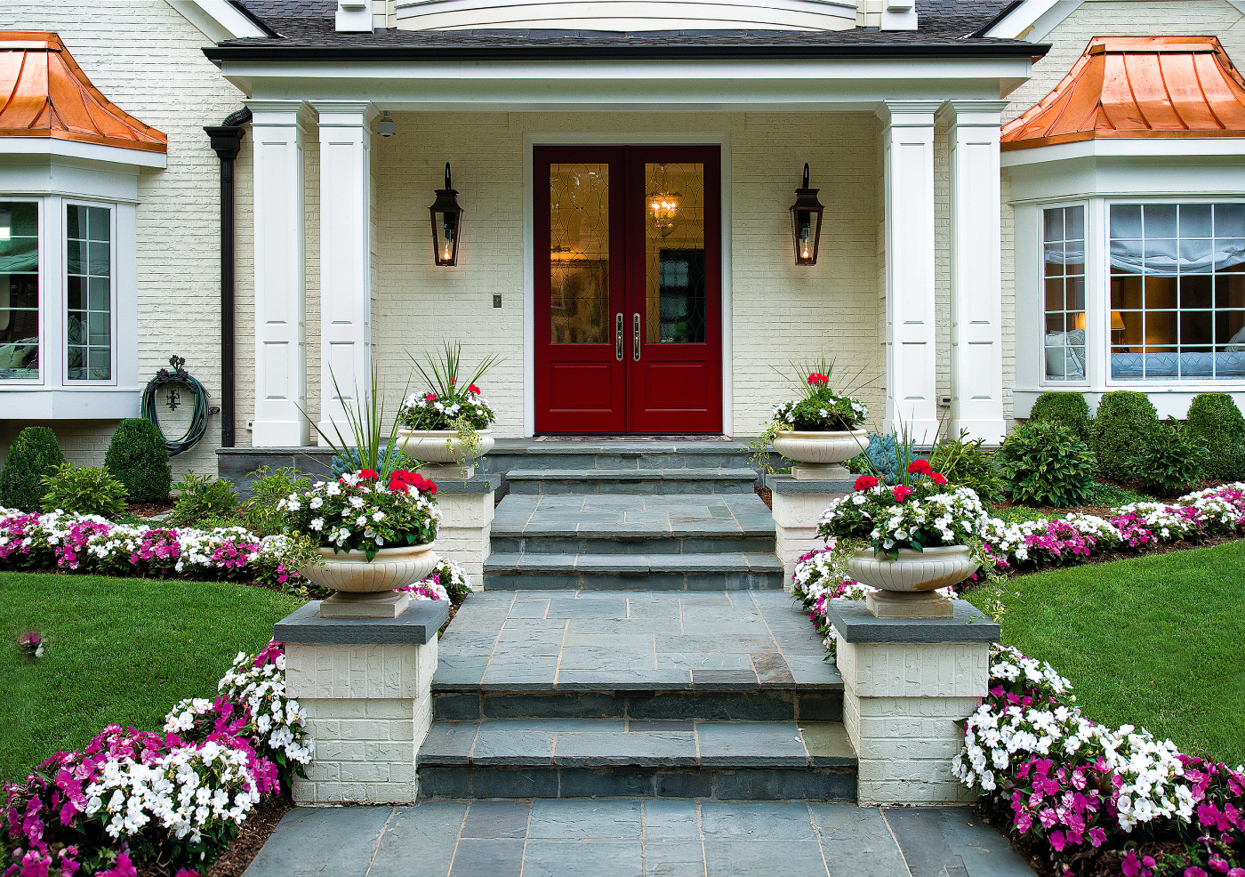 Color and Contrast: Utilize vibrant flowers and distinct foliage to accentuate key architectural details, drawing attention to elegant doorways or ornamental trims.