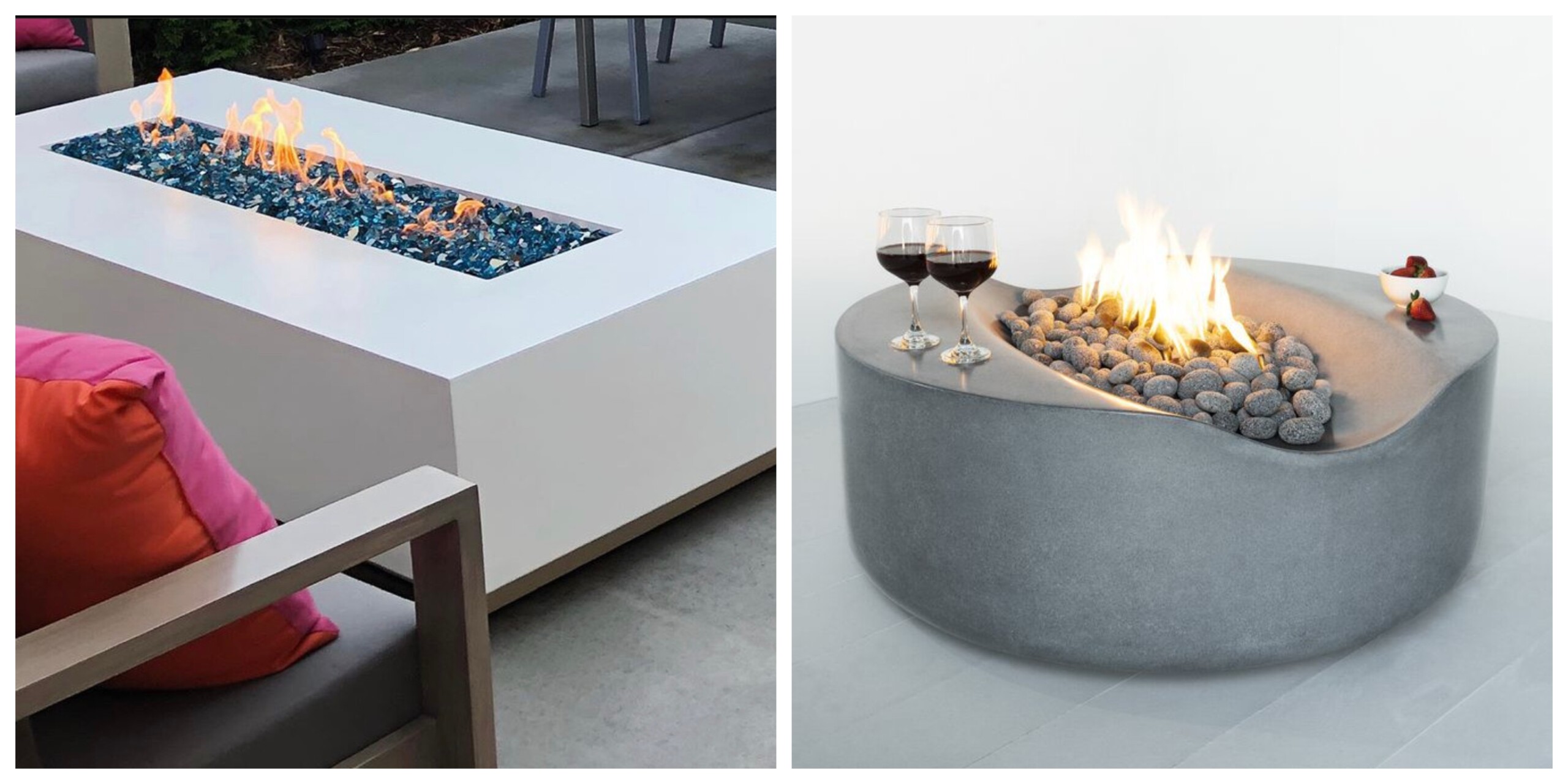Metal and precast concrete offer a variety of shapes, sizes and colors to enhance any outdoor setting. In some cases, they can even be personalized with artistic cutouts or colors. Additionally, colorful fire glass, ceramic orbs or artistic steel logs can be added as accent toppers to the burner– creating a touch of whimsy. Metal and concrete varieties serve double duty as coffee tables. If the lip area is larger than six inches, a glass or small plate can easily sit on the edge without getting too warm. The addition of a burner lid creates a solid surface when the fire pit is not in use, therefore making it more table-like.